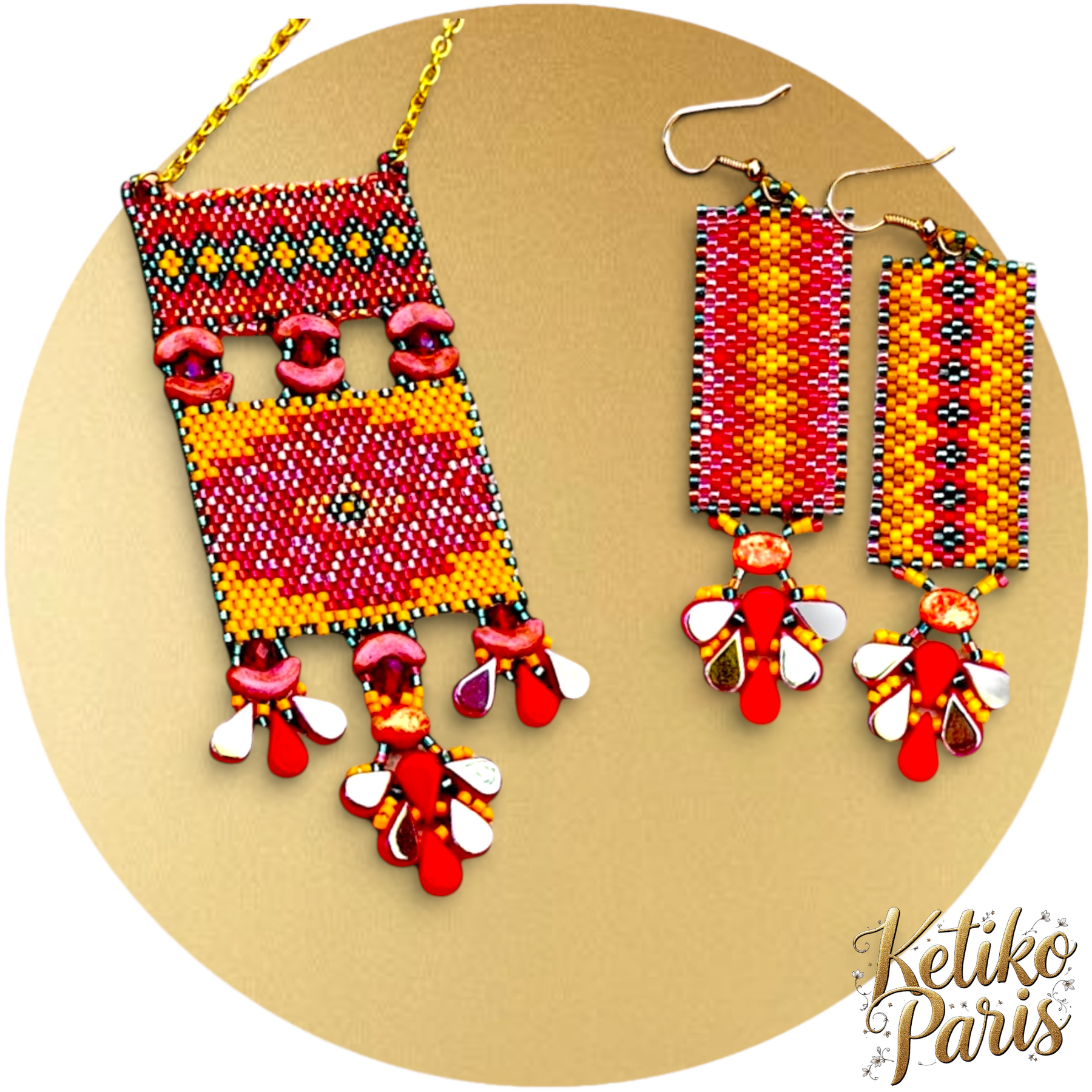 • Les bijoux sont principalement réalisés avec des perles miyuki : ce sont de minuscules perles en verre, de 1 mm, de très haute qualité, taillées au laser. L'impression visuelle de la création est souvent perçue comme celle d'un tissu chatoyant et les perles donnent des reflets irisés qui jouent avec la lumière.