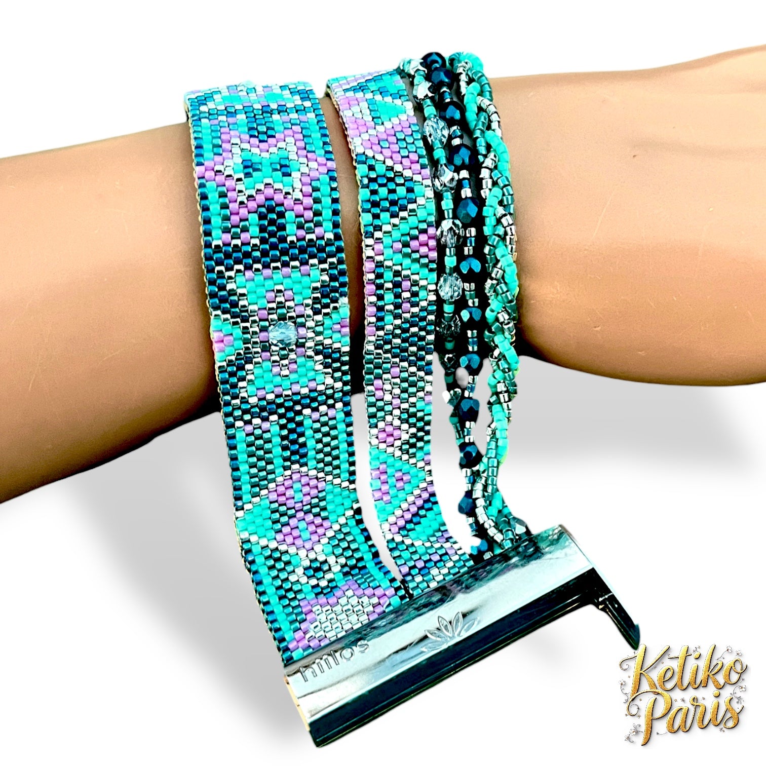 Schéma et explications pour réalisation de 3 bracelets traditionnel tissé en peyote pair et impair avec des perles miyuki delicas 11/0. Ils peuvent être portés ensemble ou séparément, en utilisant des fermoirs interchangeables Hiilos (en vente sur le site)