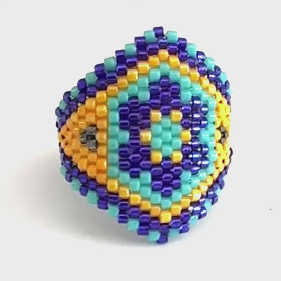Les bagues sont tissées en point peyote. L'anneau est tissé circulairement puis le reste de la bague est tissé linéairement pour les modèles en pointe.