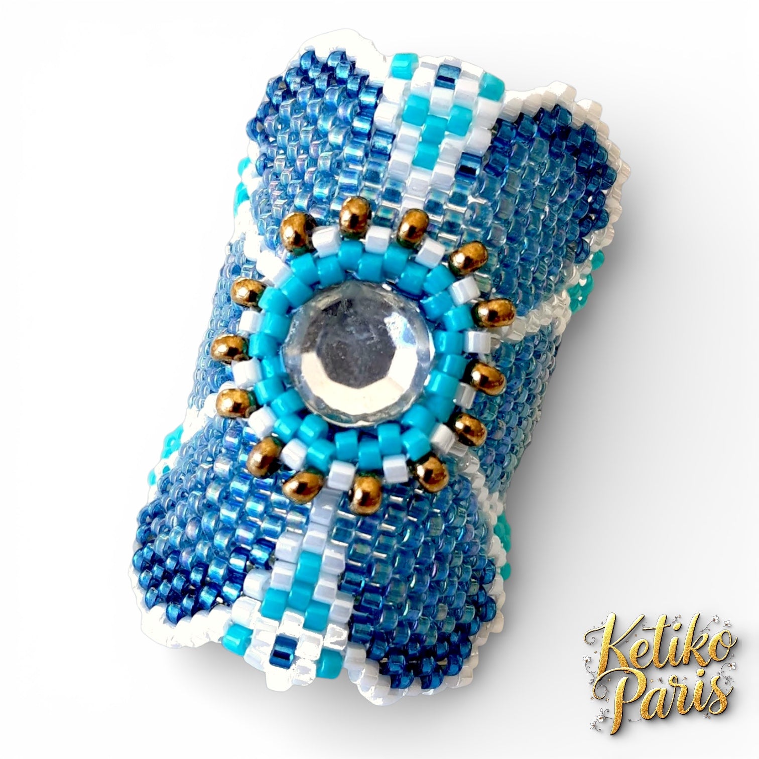 The rings are woven in peyote stitch. The ring is woven circularly then the rest of the ring is woven linearly for pointed models.