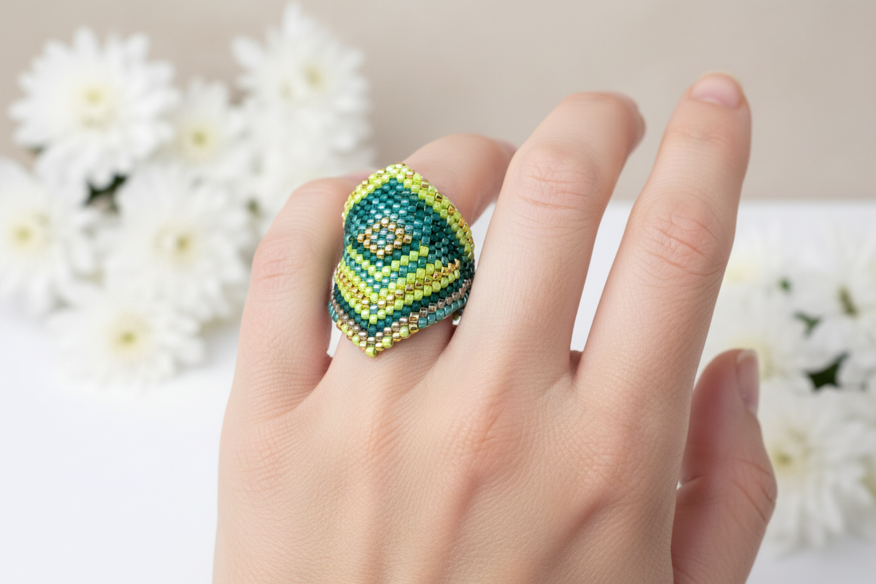 The rings are woven in peyote stitch. The ring is woven circularly then the rest of the ring is woven linearly for pointed models.