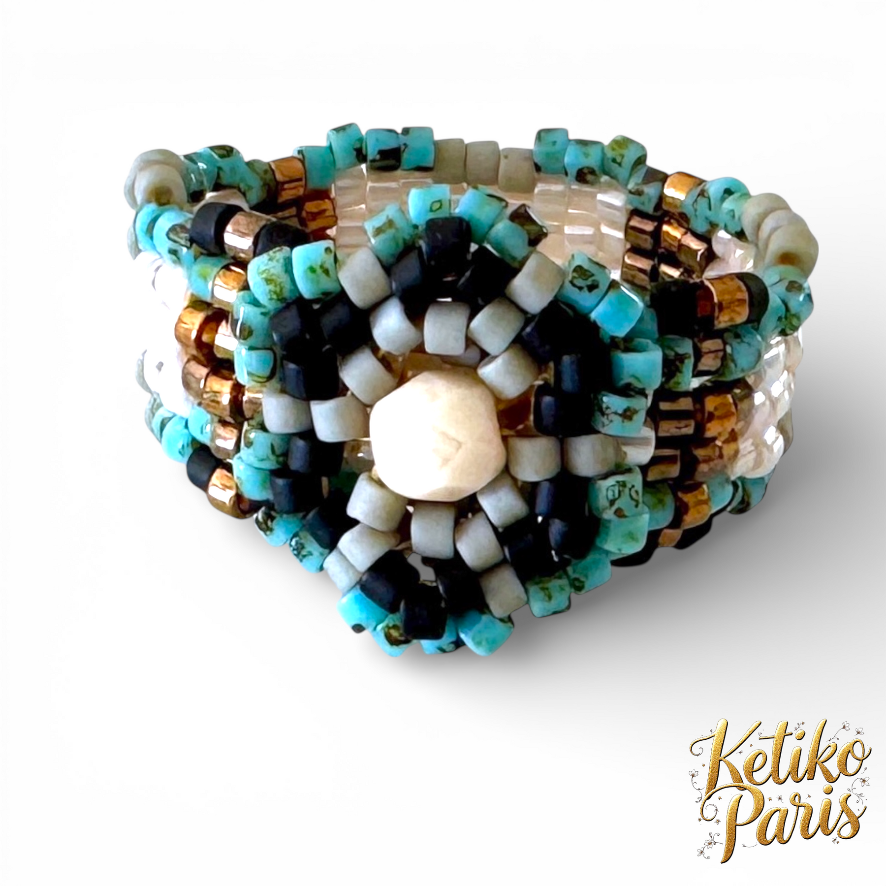 The rings are woven in peyote stitch. The ring is woven circularly then the rest of the ring is woven linearly for pointed models.