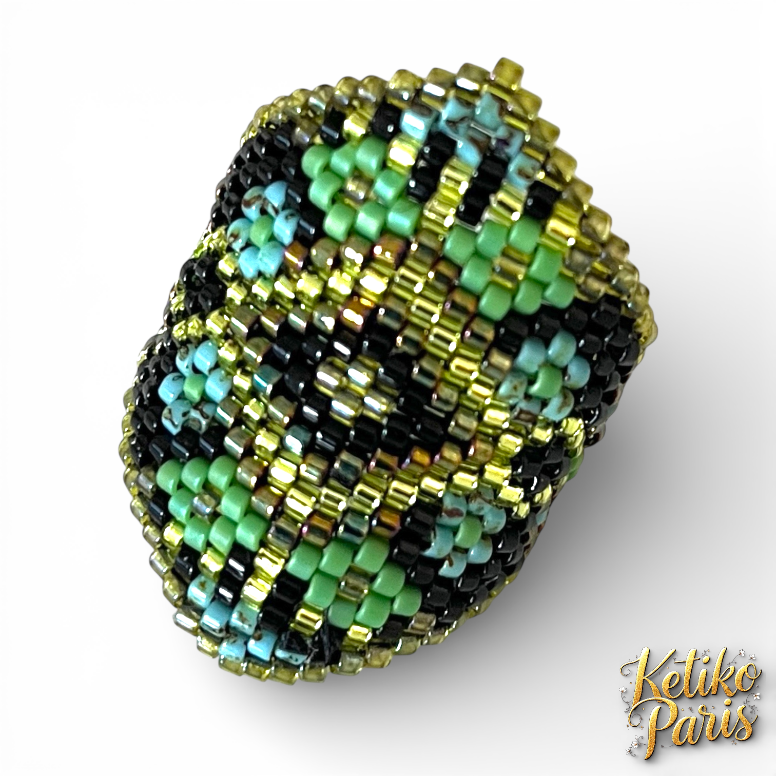 The rings are woven in peyote stitch. The ring is woven circularly then the rest of the ring is woven linearly for pointed models.