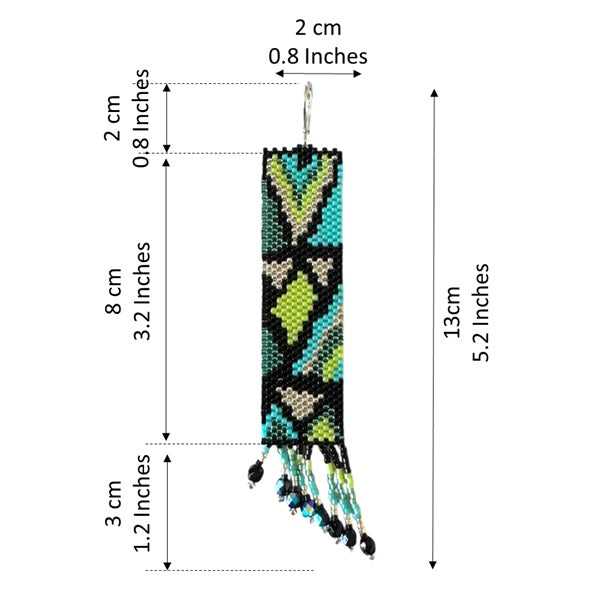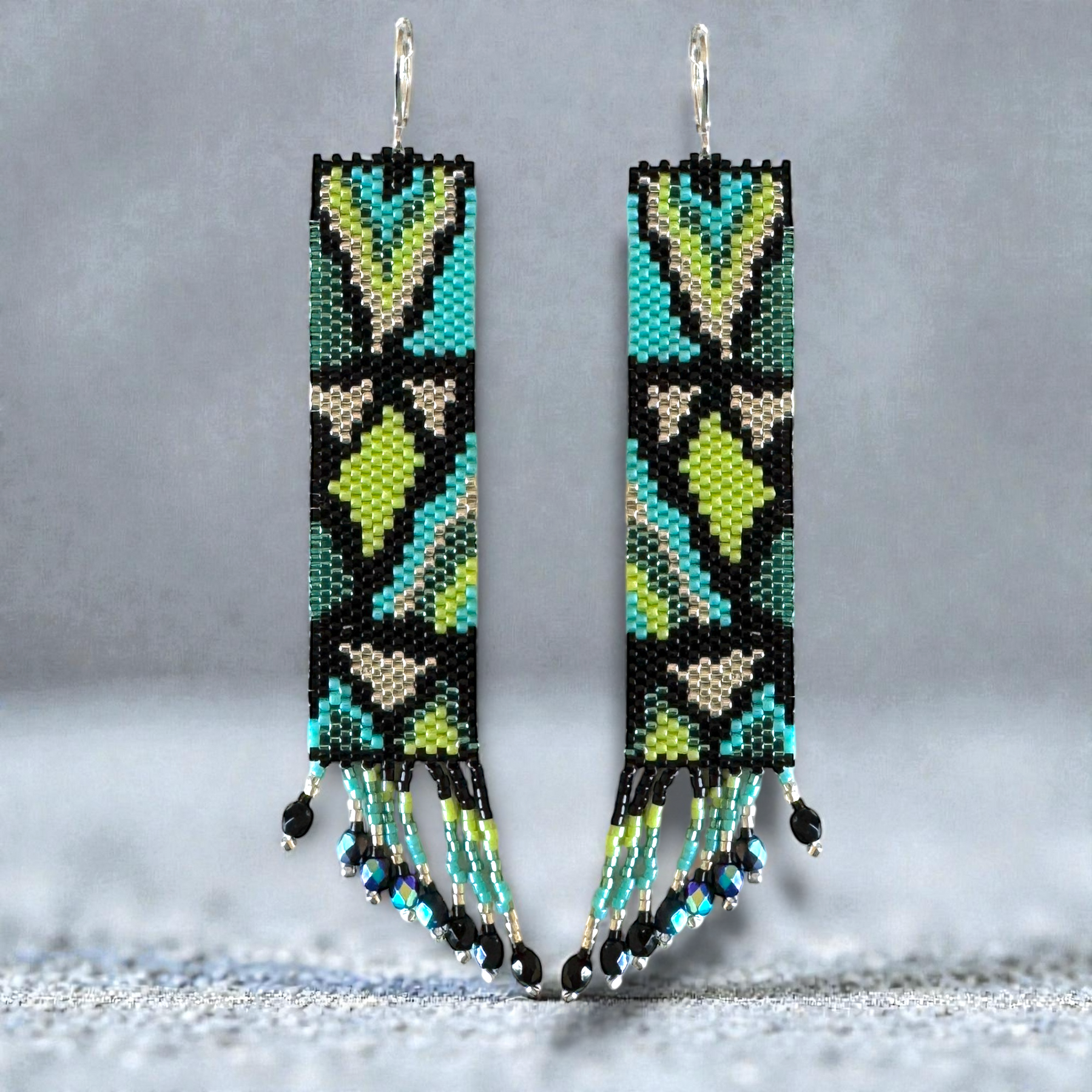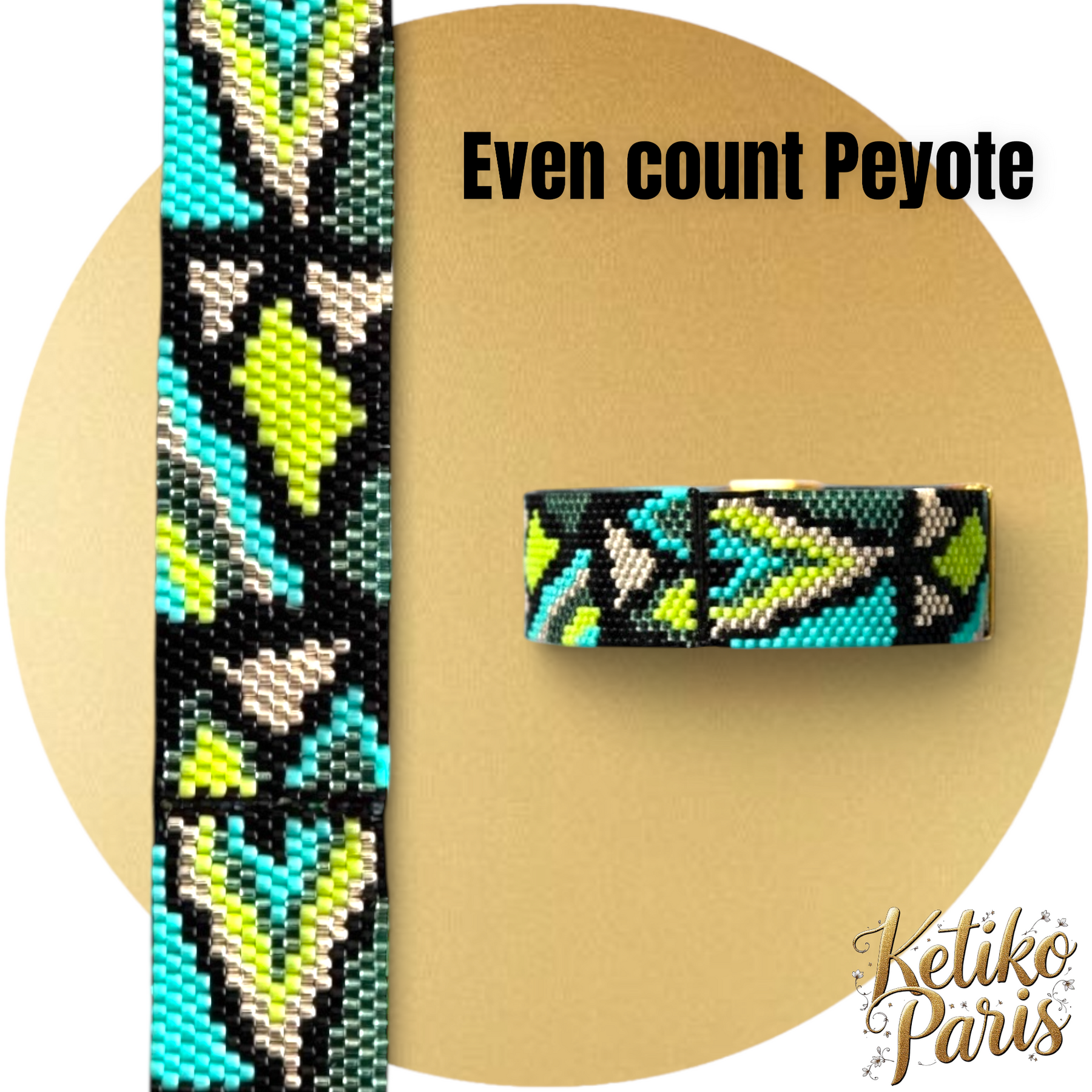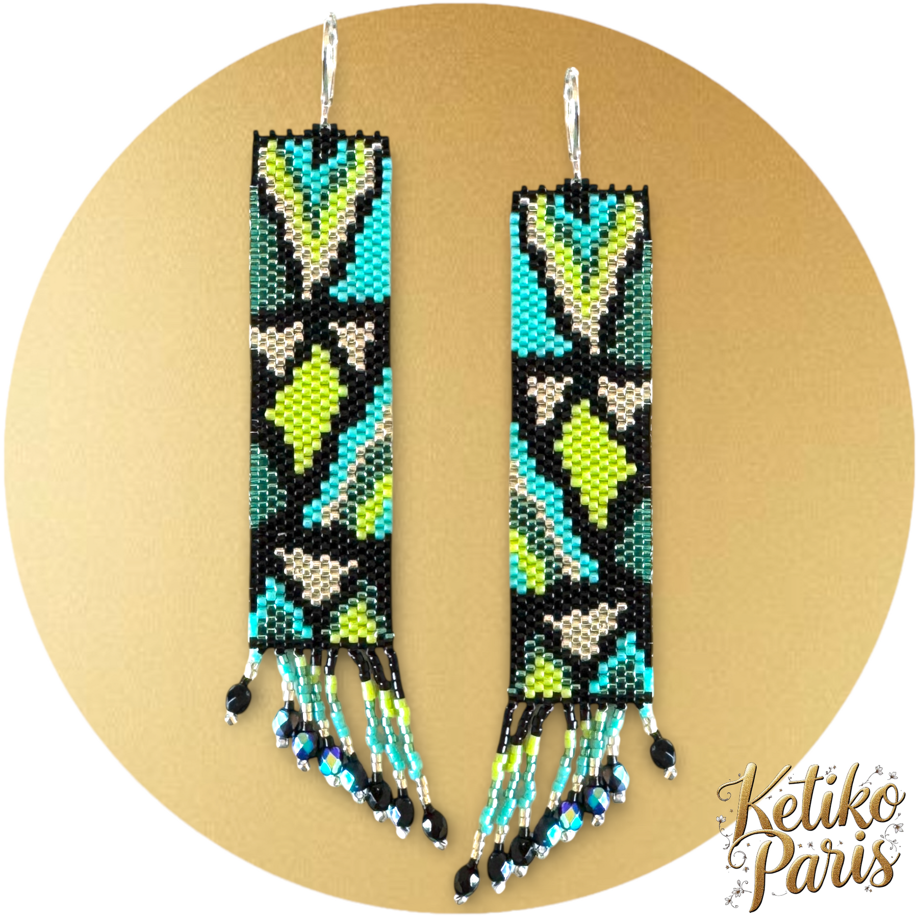 They are woven in peyote stitch but for the most part can also be woven in brick stitch