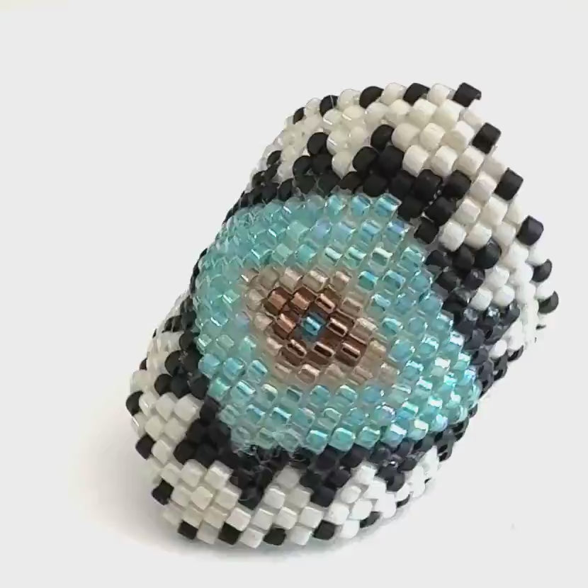 The rings are woven in peyote stitch. The ring is woven circularly then the rest of the ring is woven linearly for pointed models.