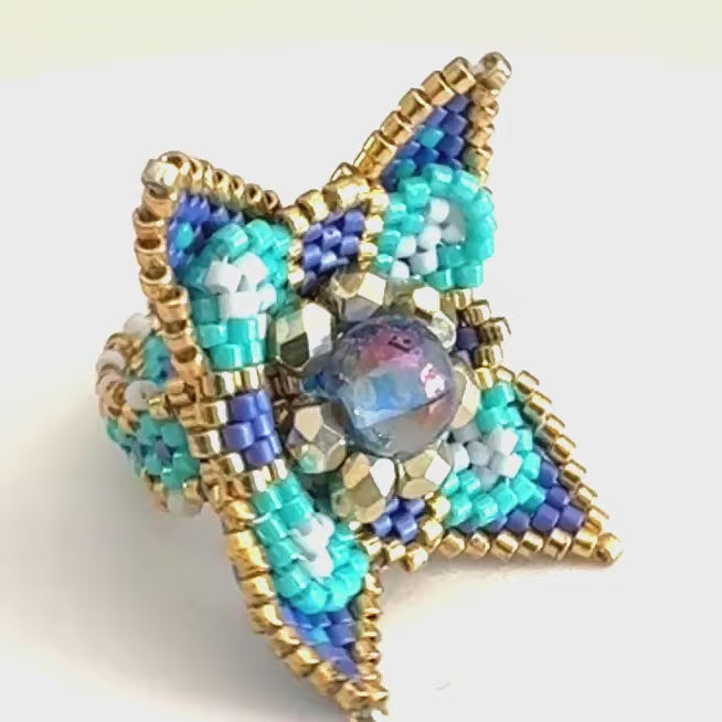 The rings are woven in peyote stitch. The ring is woven circularly then the rest of the ring is woven linearly for pointed models.