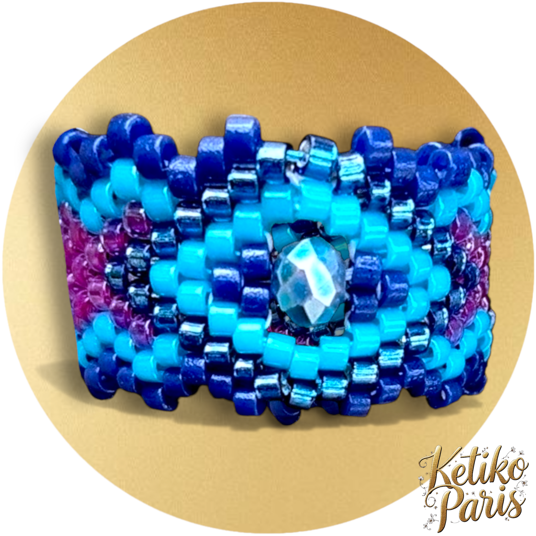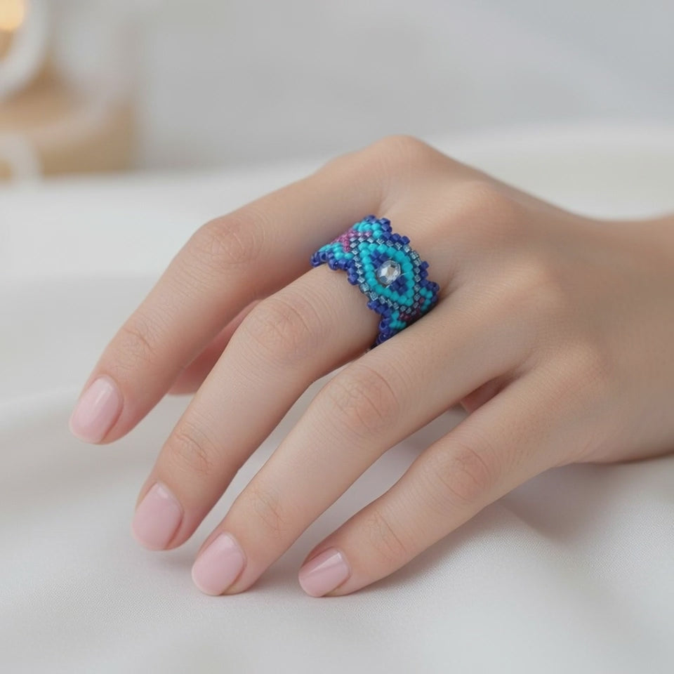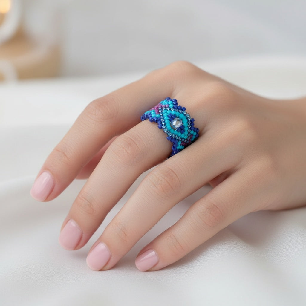The rings are woven in peyote stitch. The ring is woven circularly then the rest of the ring is woven linearly for pointed models.