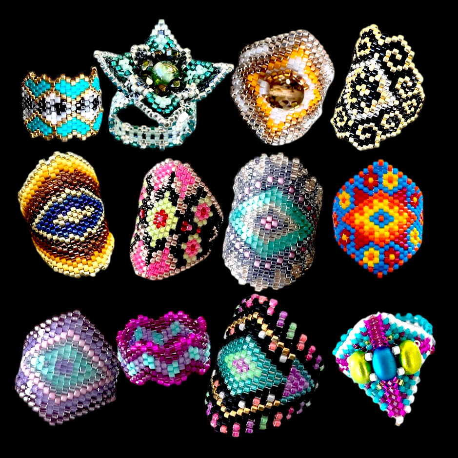 The rings are woven with Miyuki Delica beads, small laser-cut glass beads.