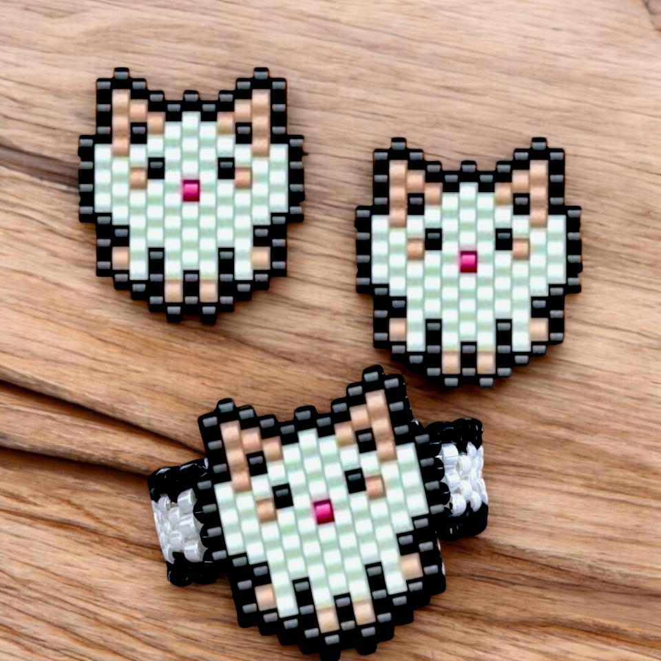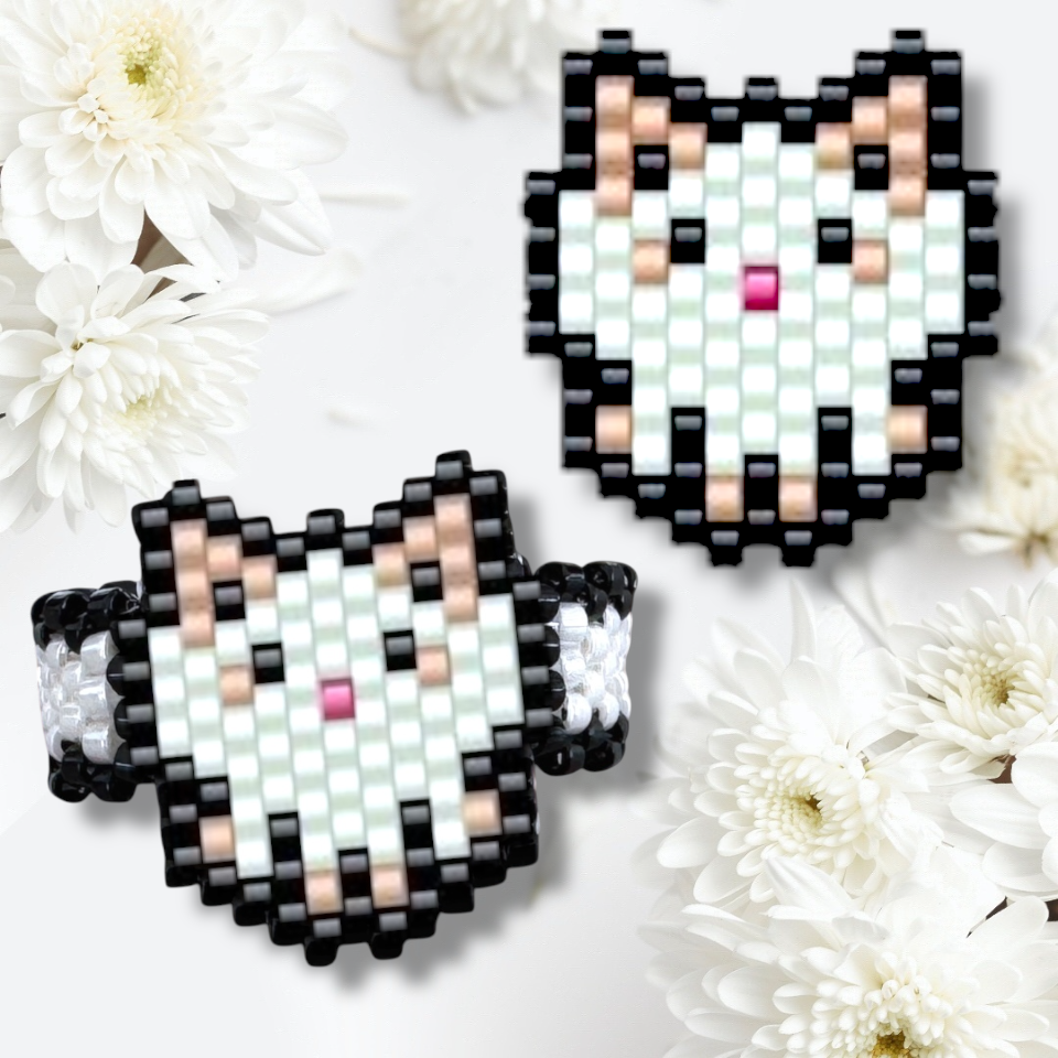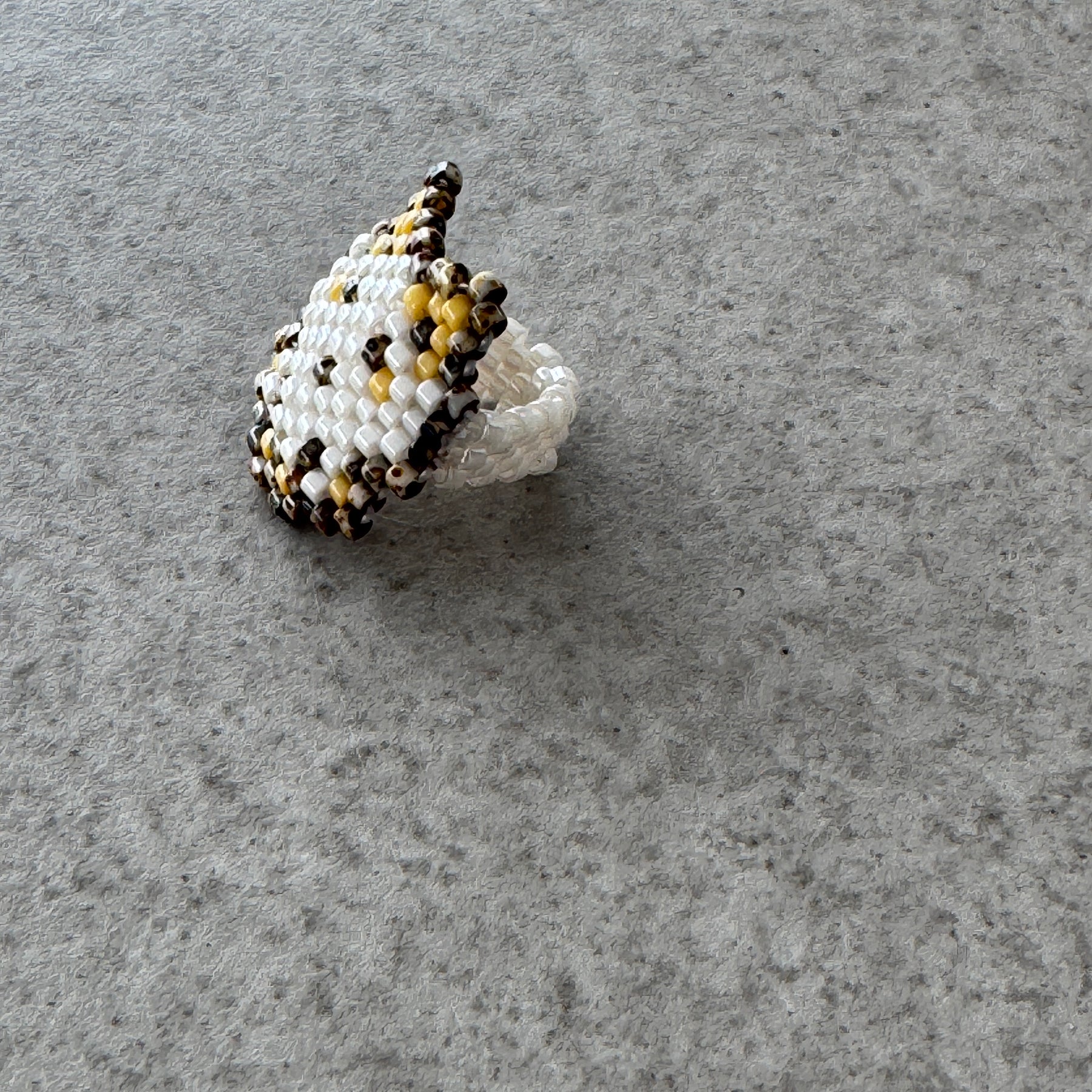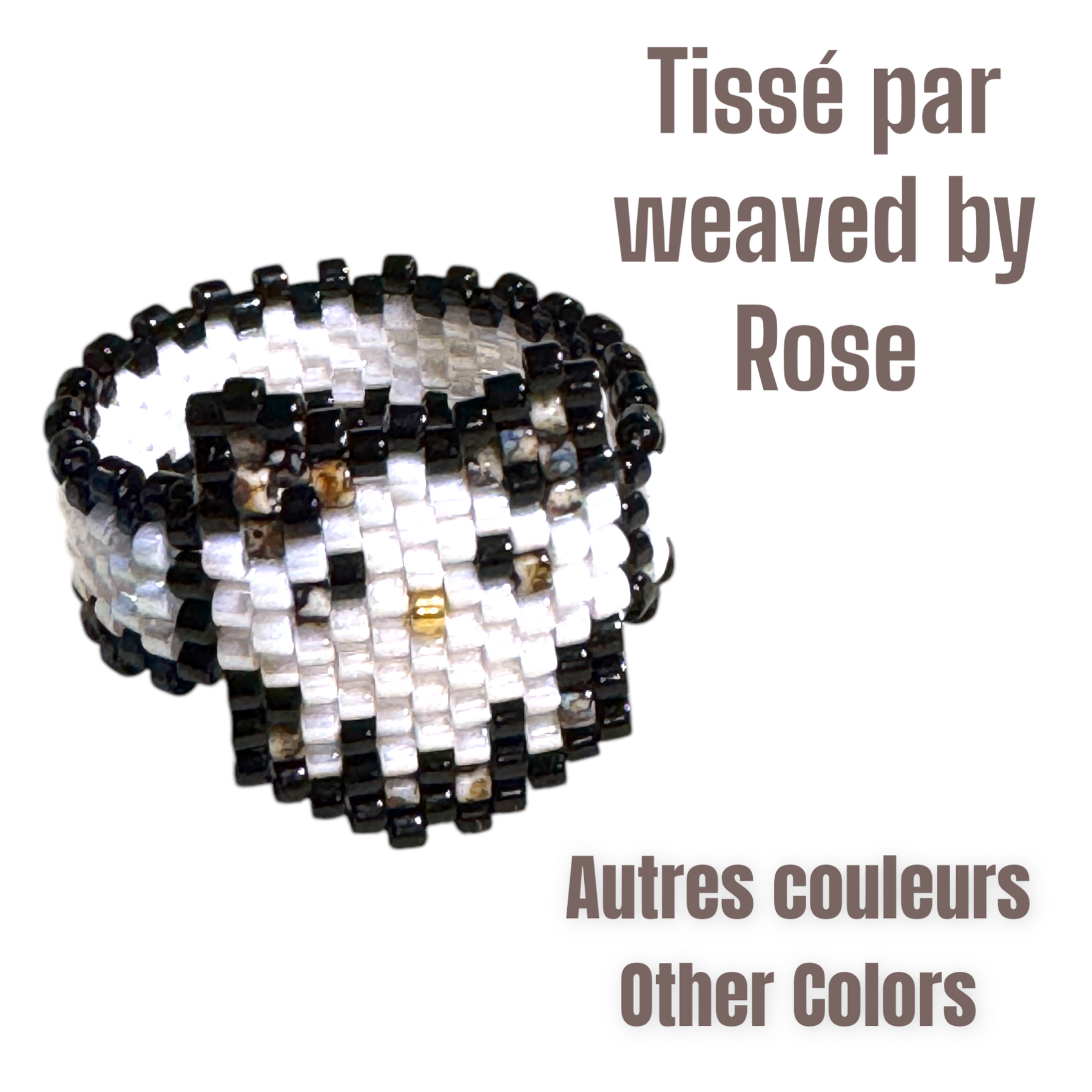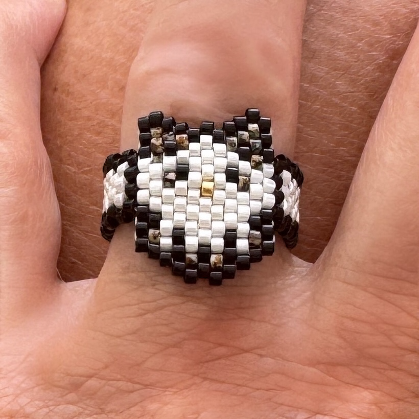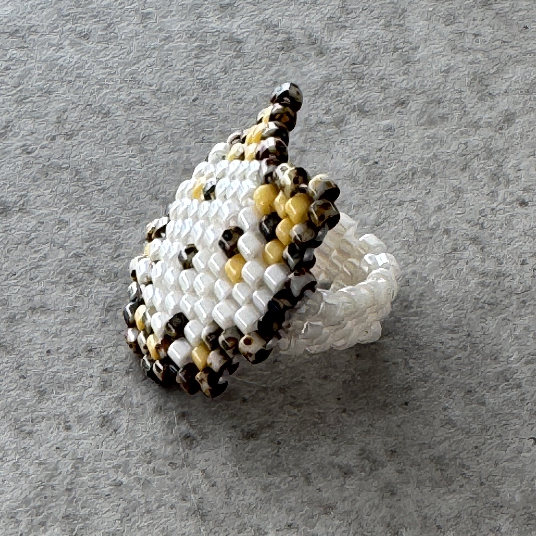 The rings are woven in peyote stitch. The ring is woven circularly then the rest of the ring is woven linearly for pointed models.