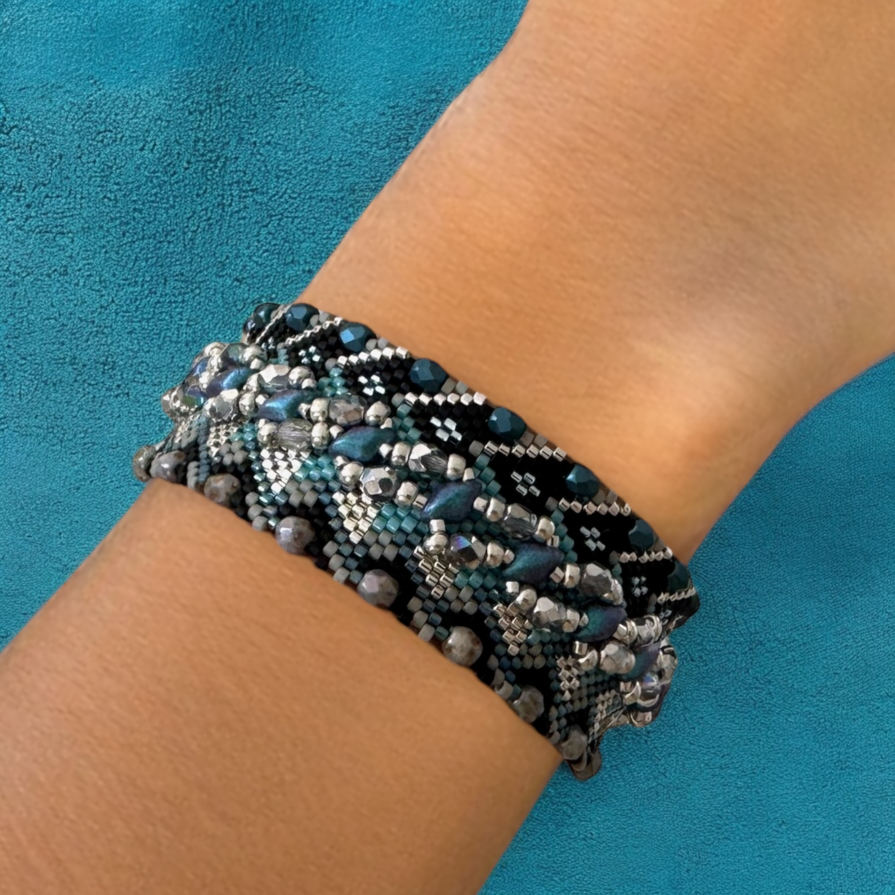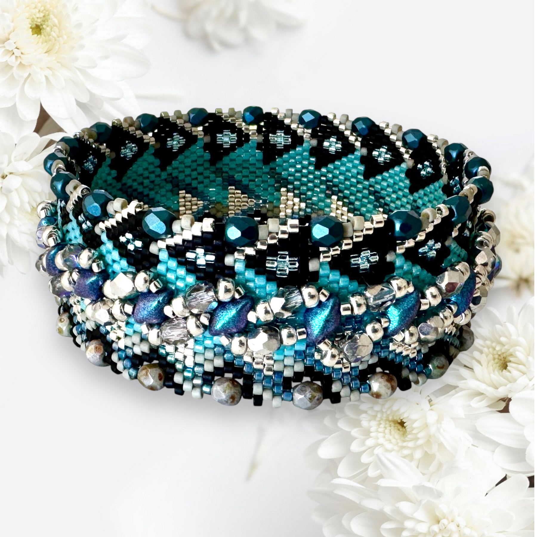 Starry azure : Pattern and explanations for making a bracelet, bangle or with clasp with 11/0 miyuki delicas beads, faceted czech beads and gemduo beads