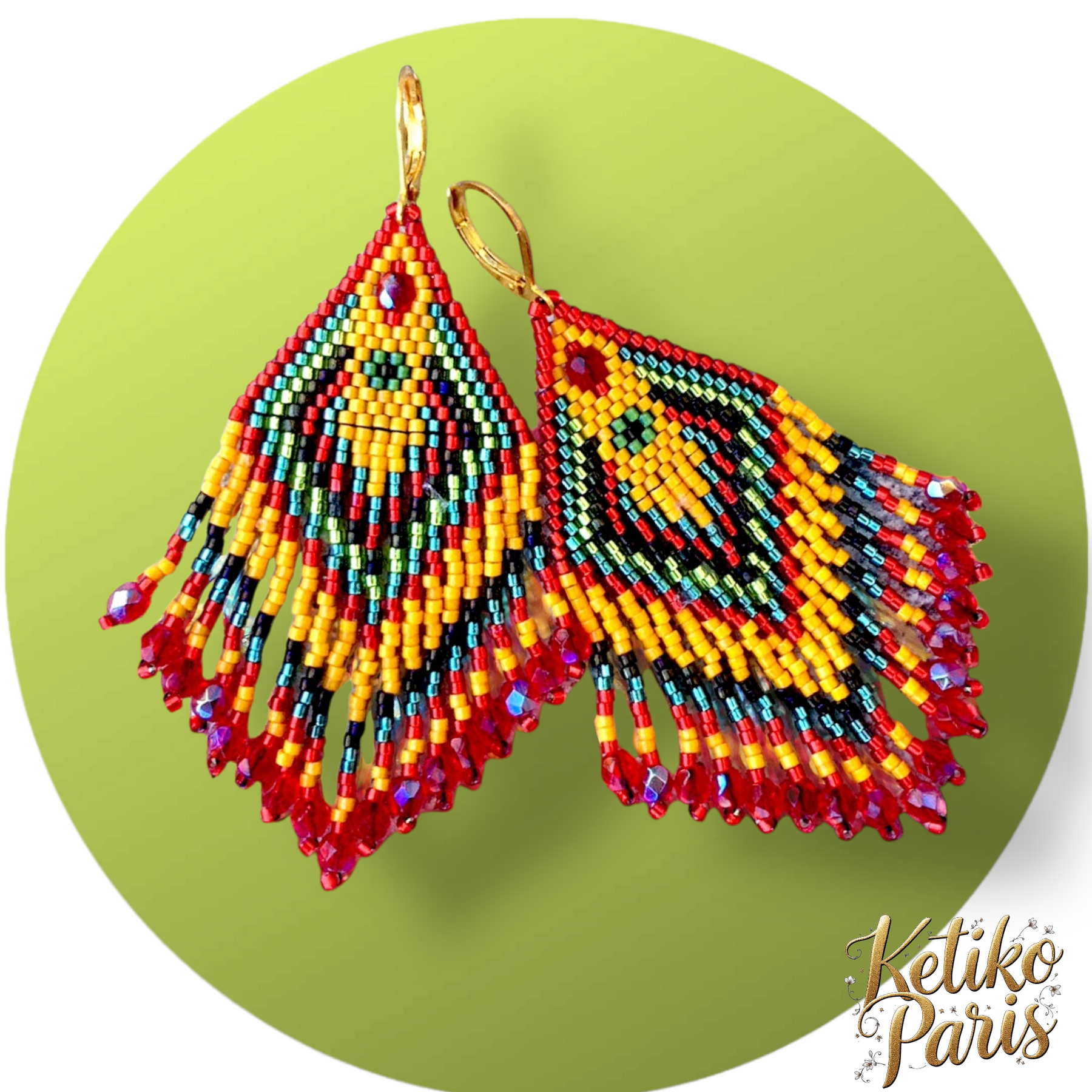 They are woven in peyote stitch but for the most part can also be woven in brick stitch