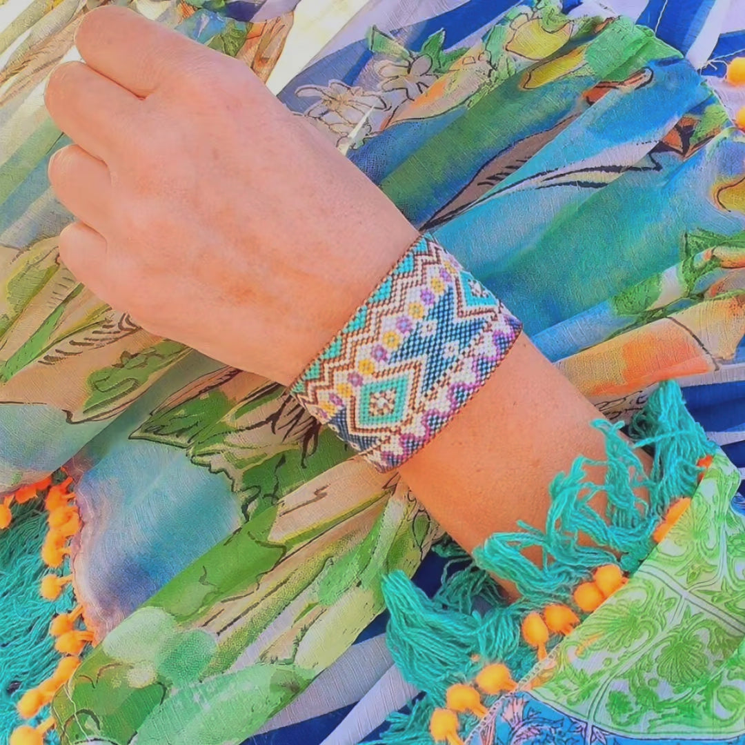 Diagram and explanations for making a bracelet, bangle or with clasp with 11/0 miyuki delicas beads. Weaving in peyote, tubular (bangle) or linear (long rows). The bracelet can also be woven in brick stitch.