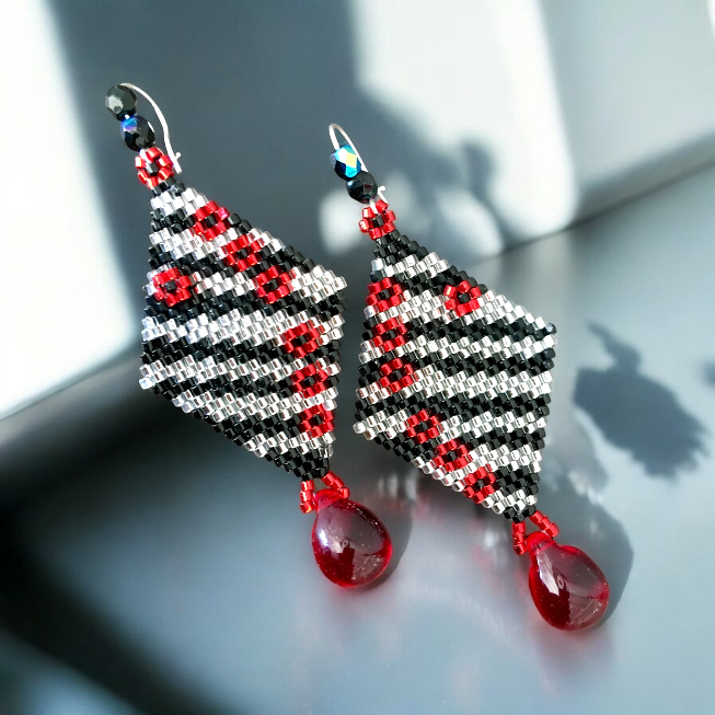 They are woven in peyote stitch but for the most part can also be woven in brick stitch