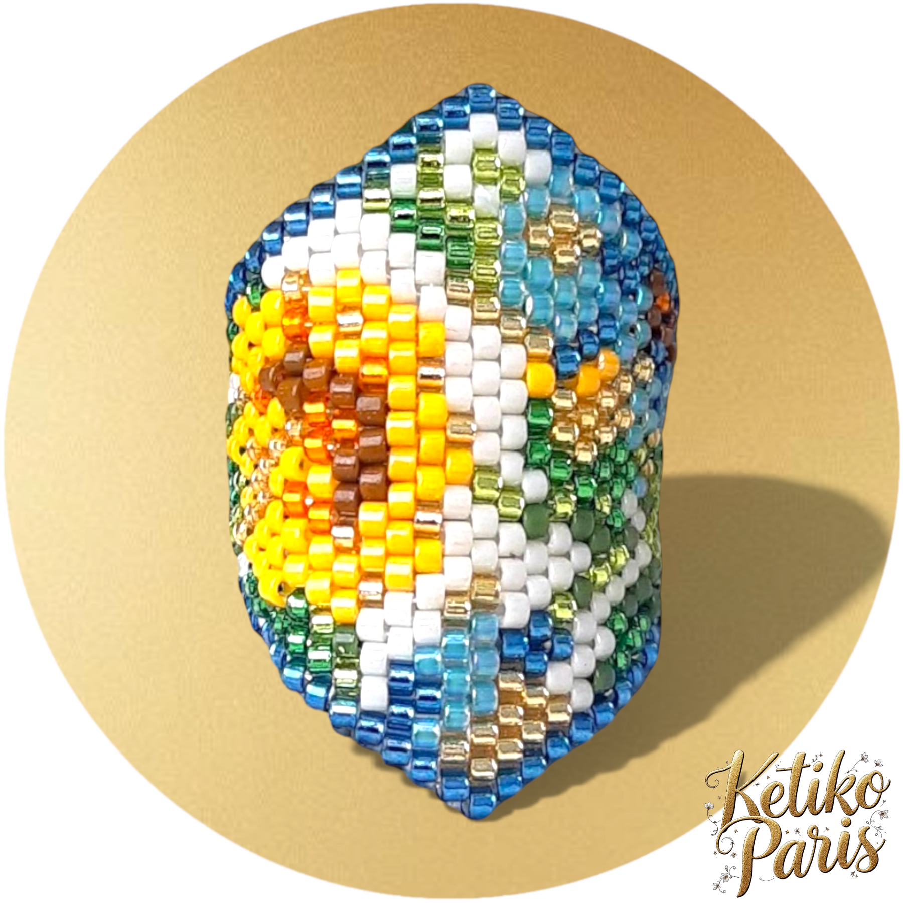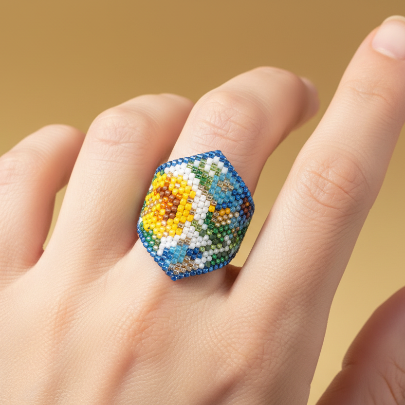 The rings are woven in peyote stitch. The ring is woven circularly then the rest of the ring is woven linearly for pointed models.