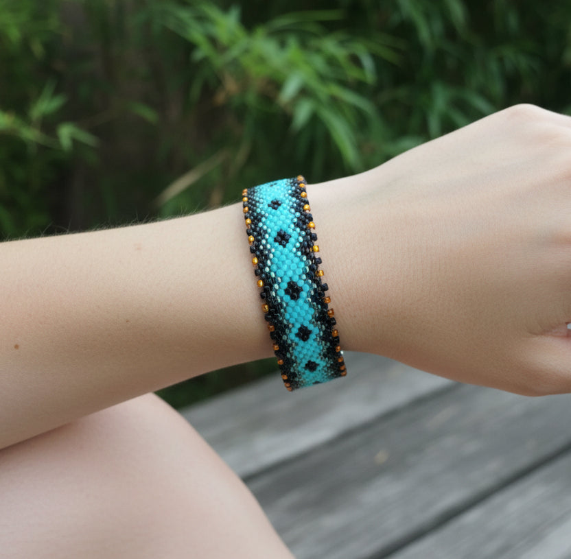 Depending on the model, I can also offer the regular peyote weaving that I call vertical peyote to distinguish it clearly, and also a loom version.