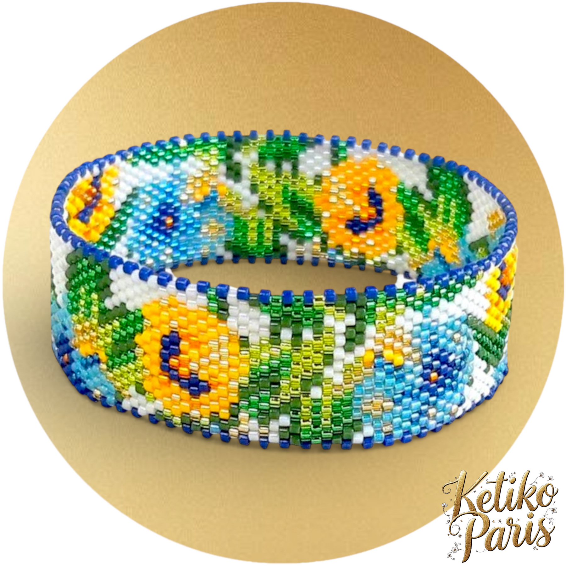 Diagram and explanations for making a bracelet, bangle or with clasp with 11/0 miyuki delicas beads. Weaving in peyote, tubular (bangle) or linear (long rows). The bracelet can also be woven in brick stitch.