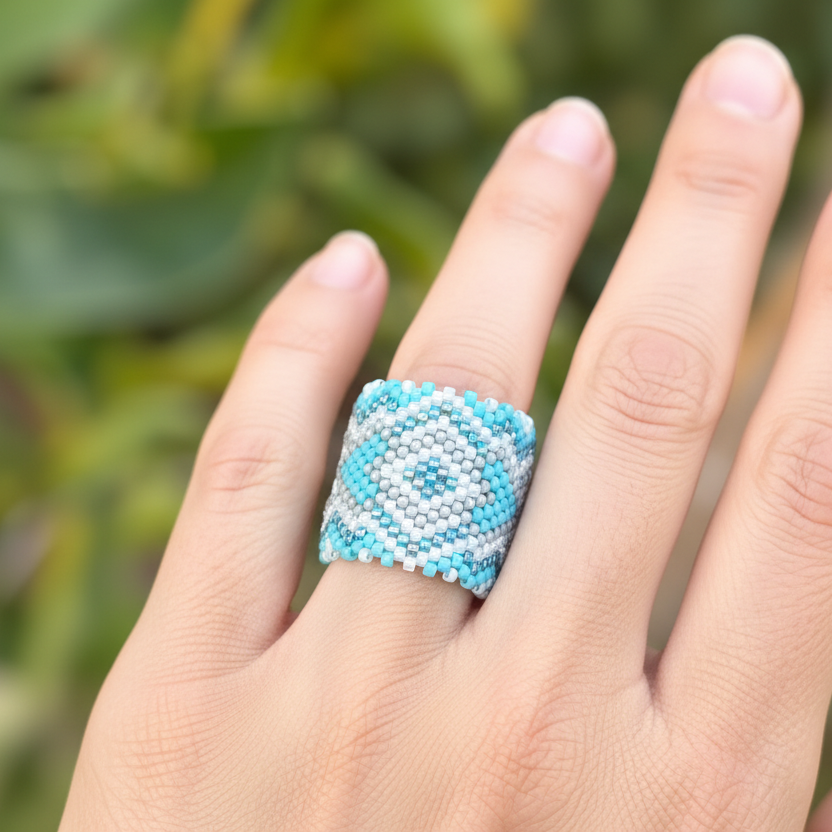The rings are woven in peyote stitch. The ring is woven circularly then the rest of the ring is woven linearly for pointed models.