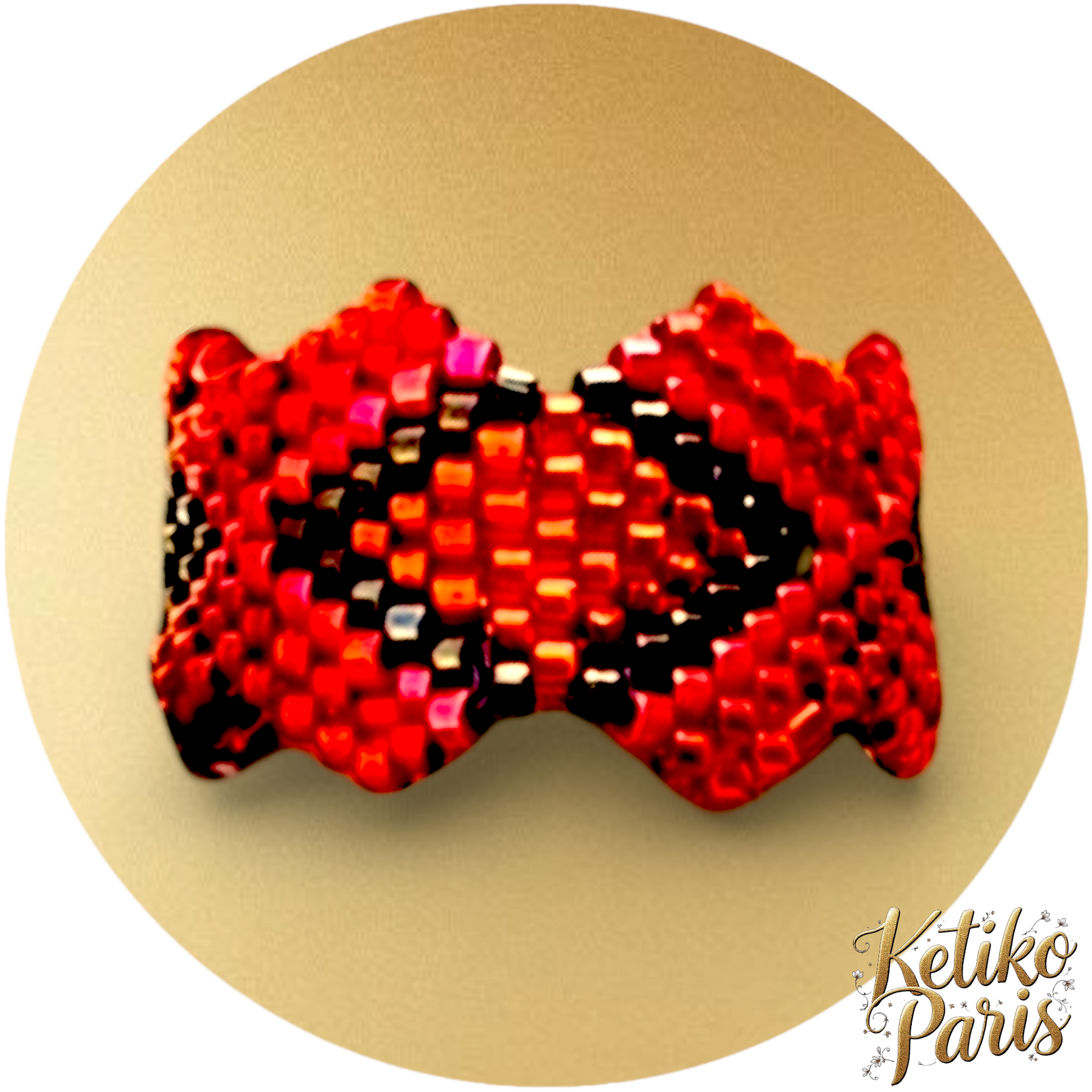 The rings are woven in peyote stitch. The ring is woven circularly then the rest of the ring is woven linearly for pointed models.