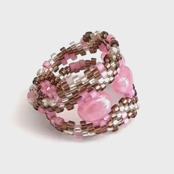 Les bagues sont tissées en point peyote. L'anneau est tissé circulairement puis le reste de la bague est tissé linéairement pour les modèles en pointe.