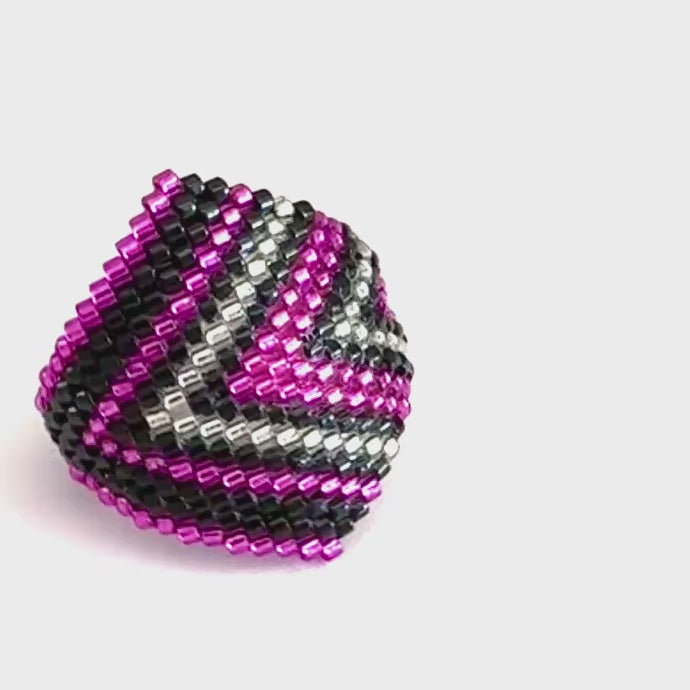 Les bagues sont tissées en point peyote. L'anneau est tissé circulairement puis le reste de la bague est tissé linéairement pour les modèles en pointe.