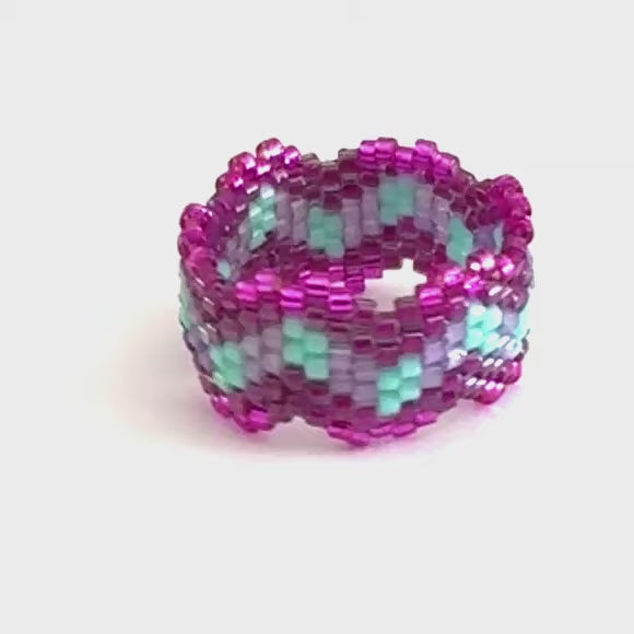 Les bagues sont tissées en point peyote. L'anneau est tissé circulairement puis le reste de la bague est tissé linéairement pour les modèles en pointe.