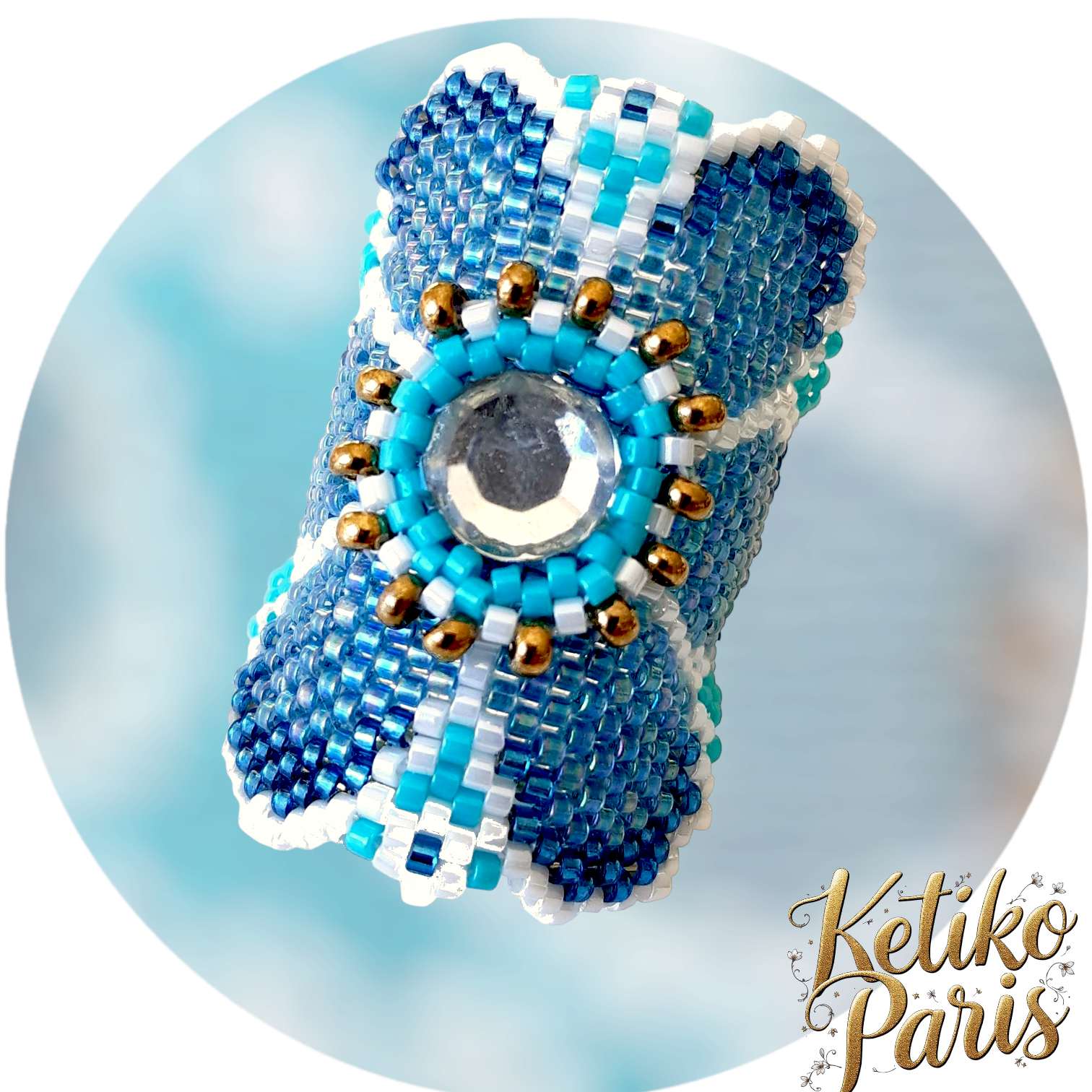 Les bagues sont tissées en point peyote. L'anneau est tissé circulairement puis le reste de la bague est tissé linéairement pour les modèles en pointe.