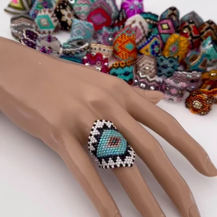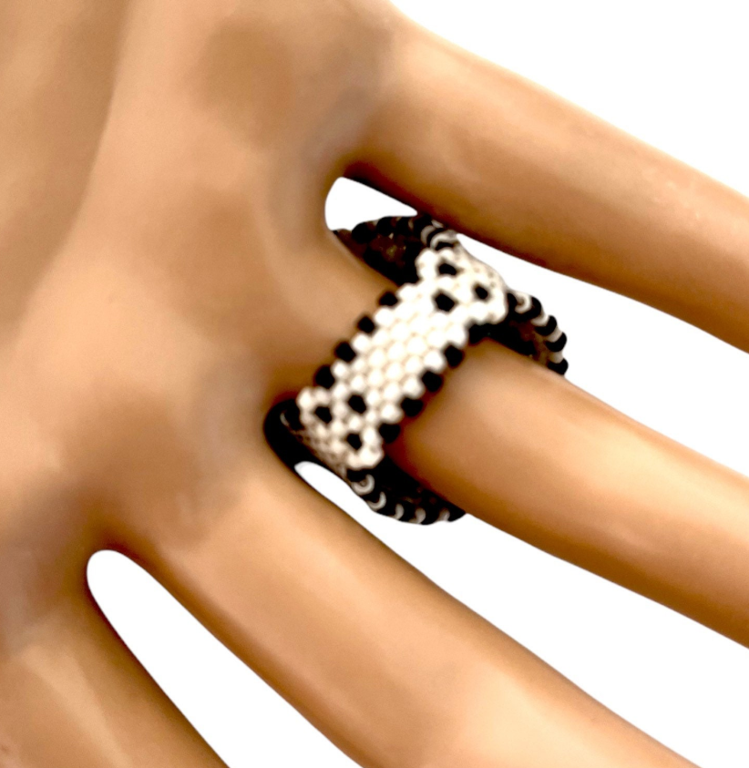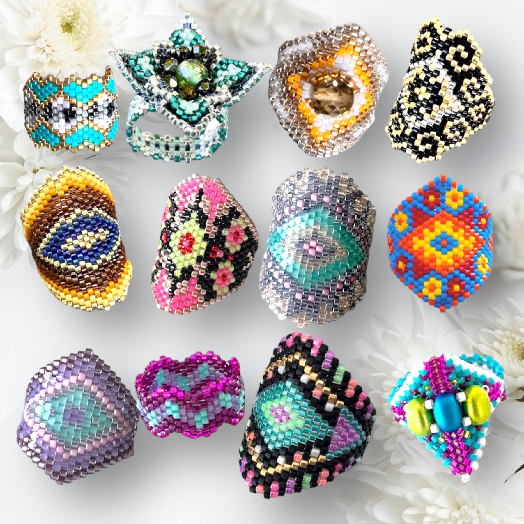Les bagues sont tissées avec des perles miyuki delicas, petites perles de verre taillées au laser