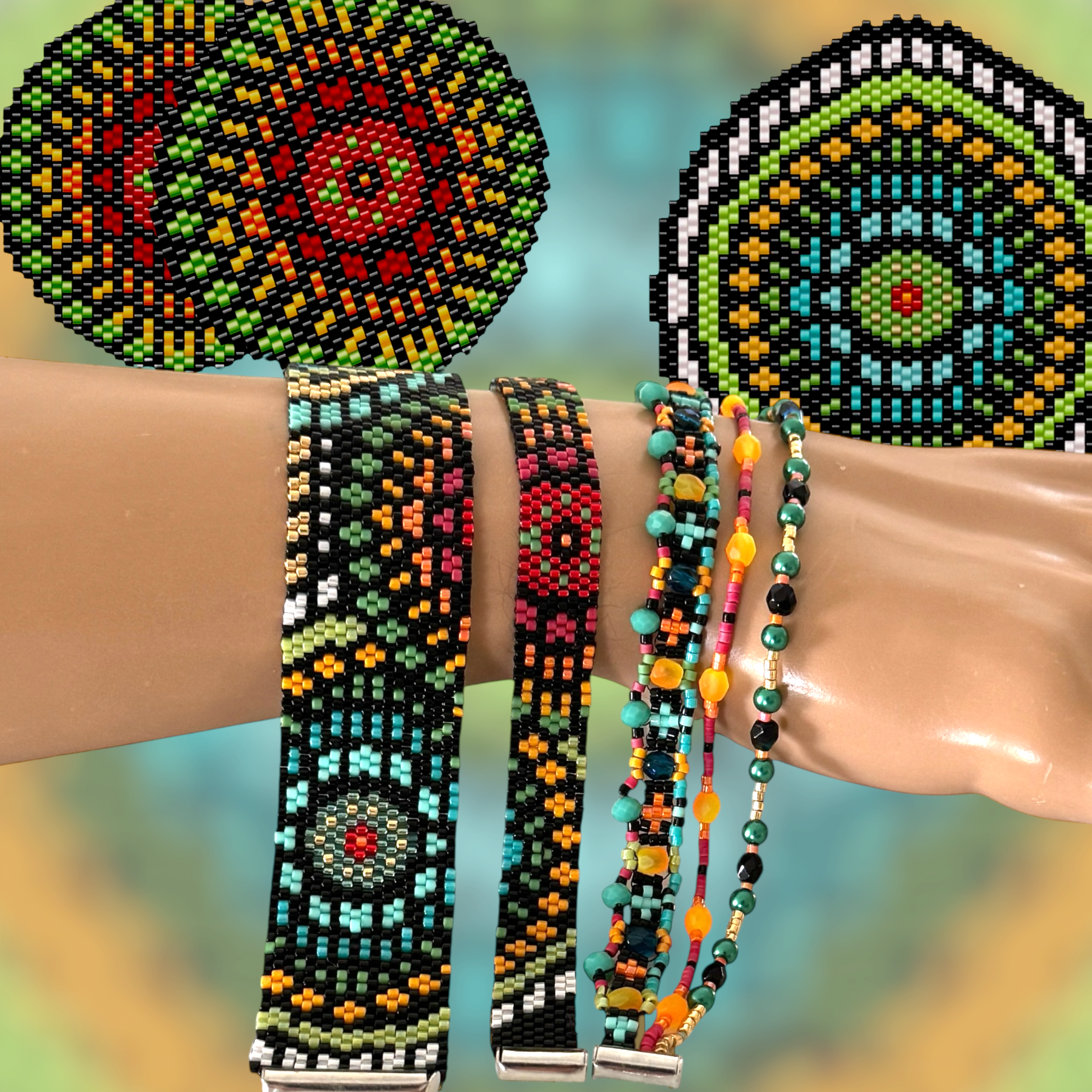 Le tissage est réalisé en point peyote, mais ils peuvent aussi être tissés en point brique (brick stitch) pour la plupart des modèles, excepté ceux tissés en peyote double ou triple ou ceux avec des inclusions de perles plus grosses.
