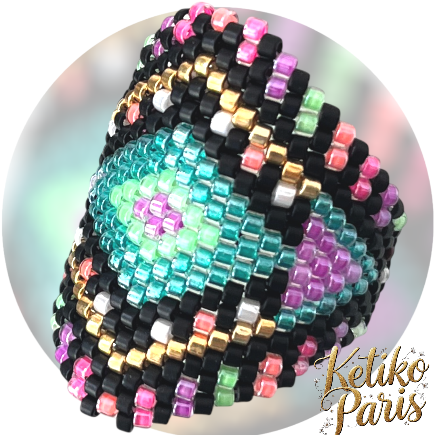 Les bagues sont tissées en point peyote. L'anneau est tissé circulairement puis le reste de la bague est tissé linéairement pour les modèles en pointe.