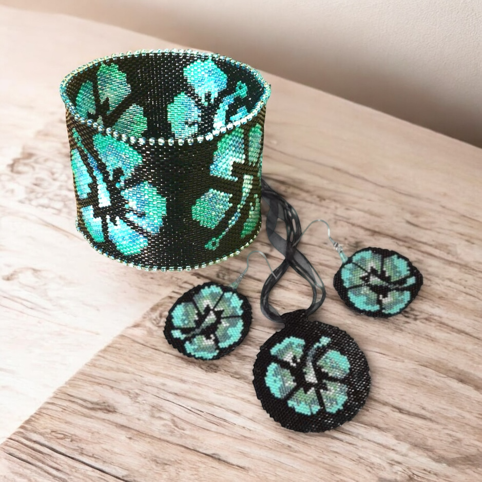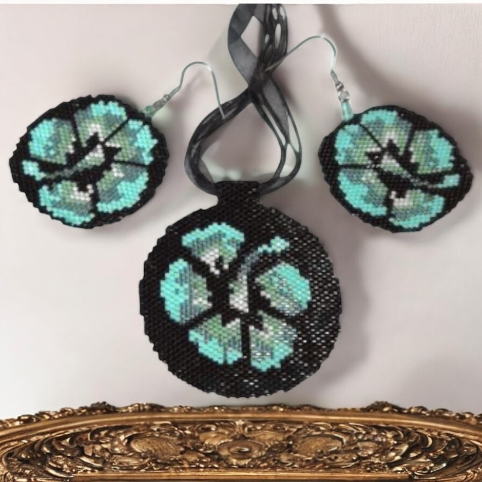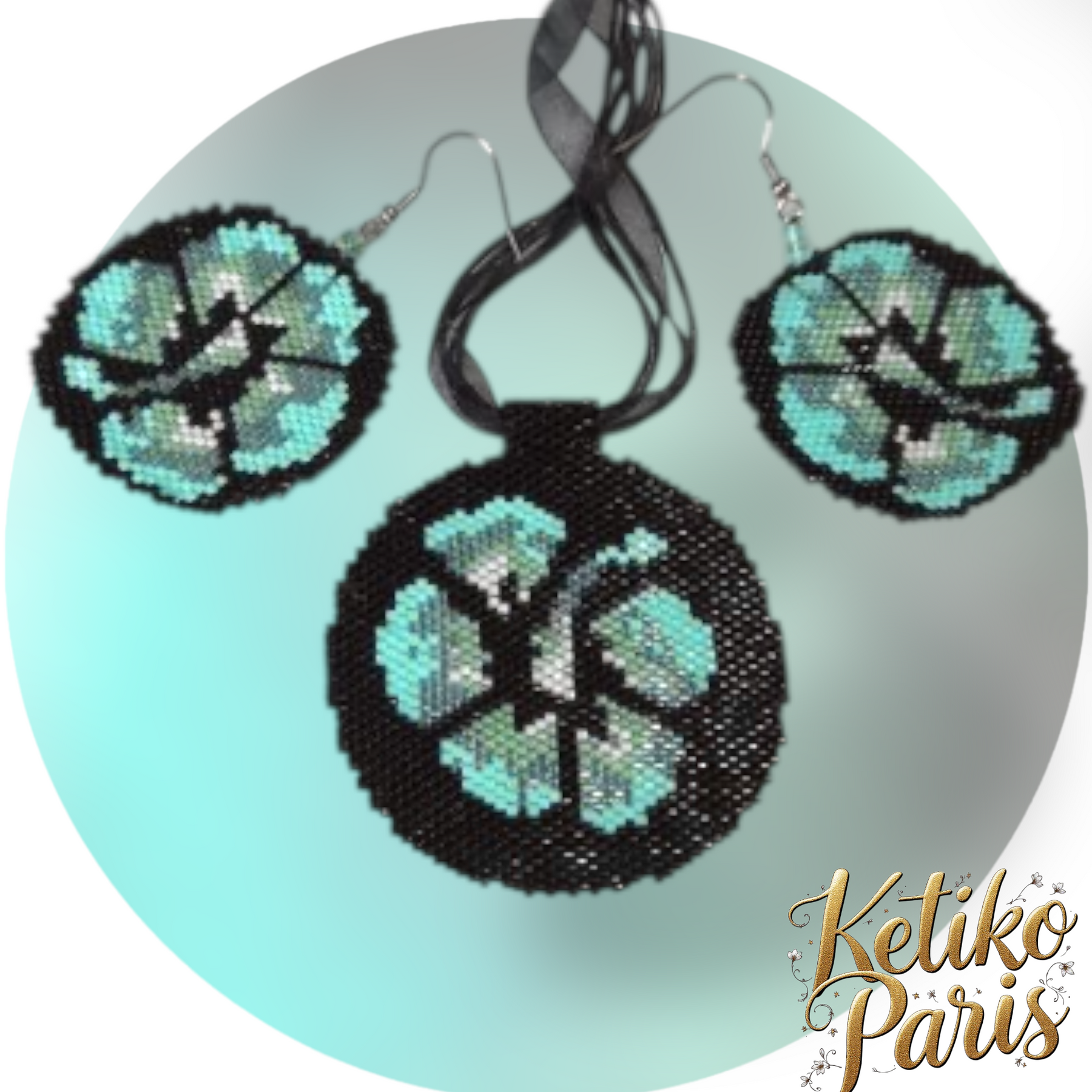 Schéma Peyote / brick stitch et explications pour réaliser 2 pendentifs de tailles différentes et un tou de cou pour des boucles d'oreilles et un collier tissé en perles miyuki delicas 11/0