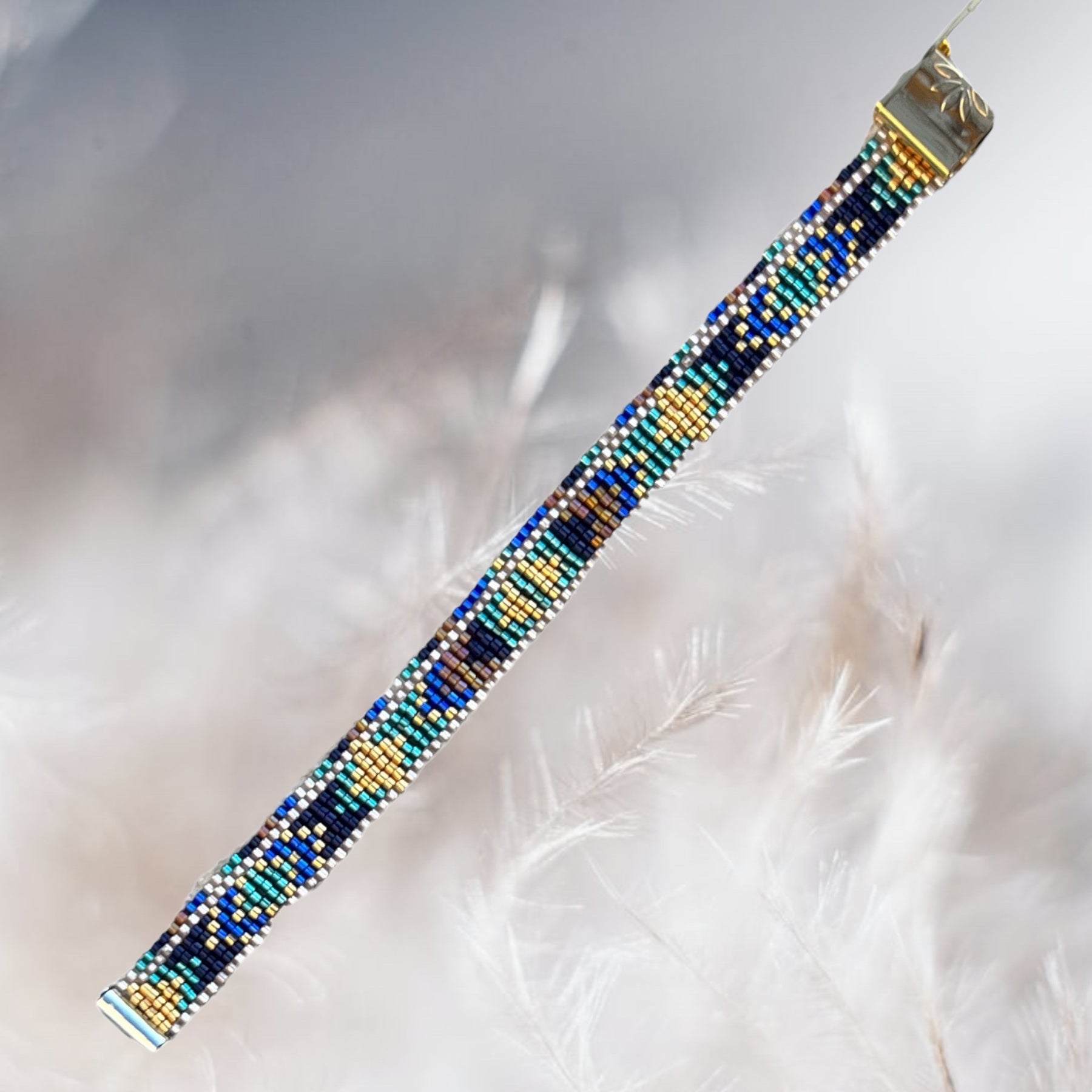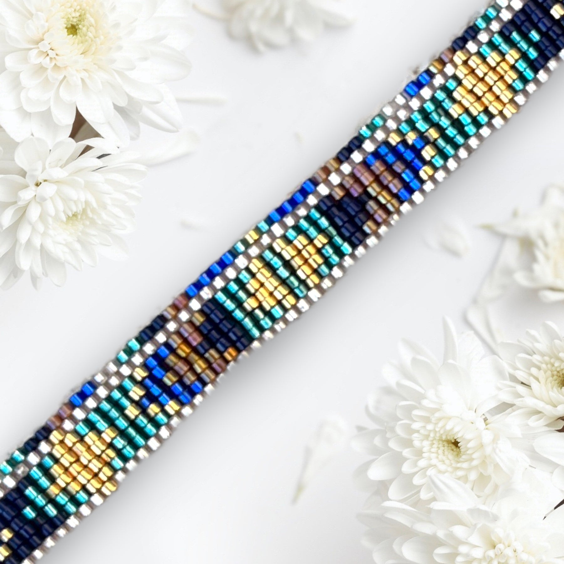 Ce modèle est réalisé dans un tissage peyote classique, pair ou impair. Je propose parfois une version paire et impaire dans le même modèle