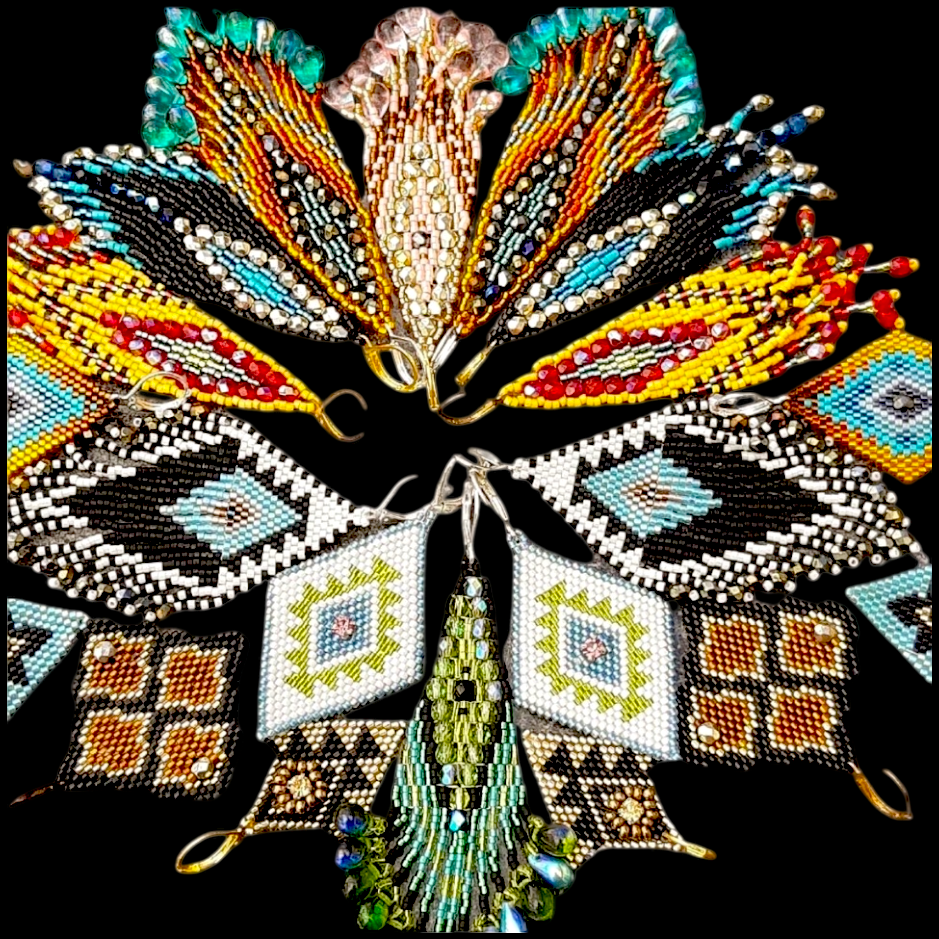 - Les bijoux sont principalement réalisés avec des perles miyuki : ce sont de minuscules perles en verre, de 1 mm, de très haute qualité, taillées au laser. L'impression visuelle de la création est souvent perçue comme celle d'un tissu chatoyant et les perles donnent des reflets irisés qui jouent avec la lumière.