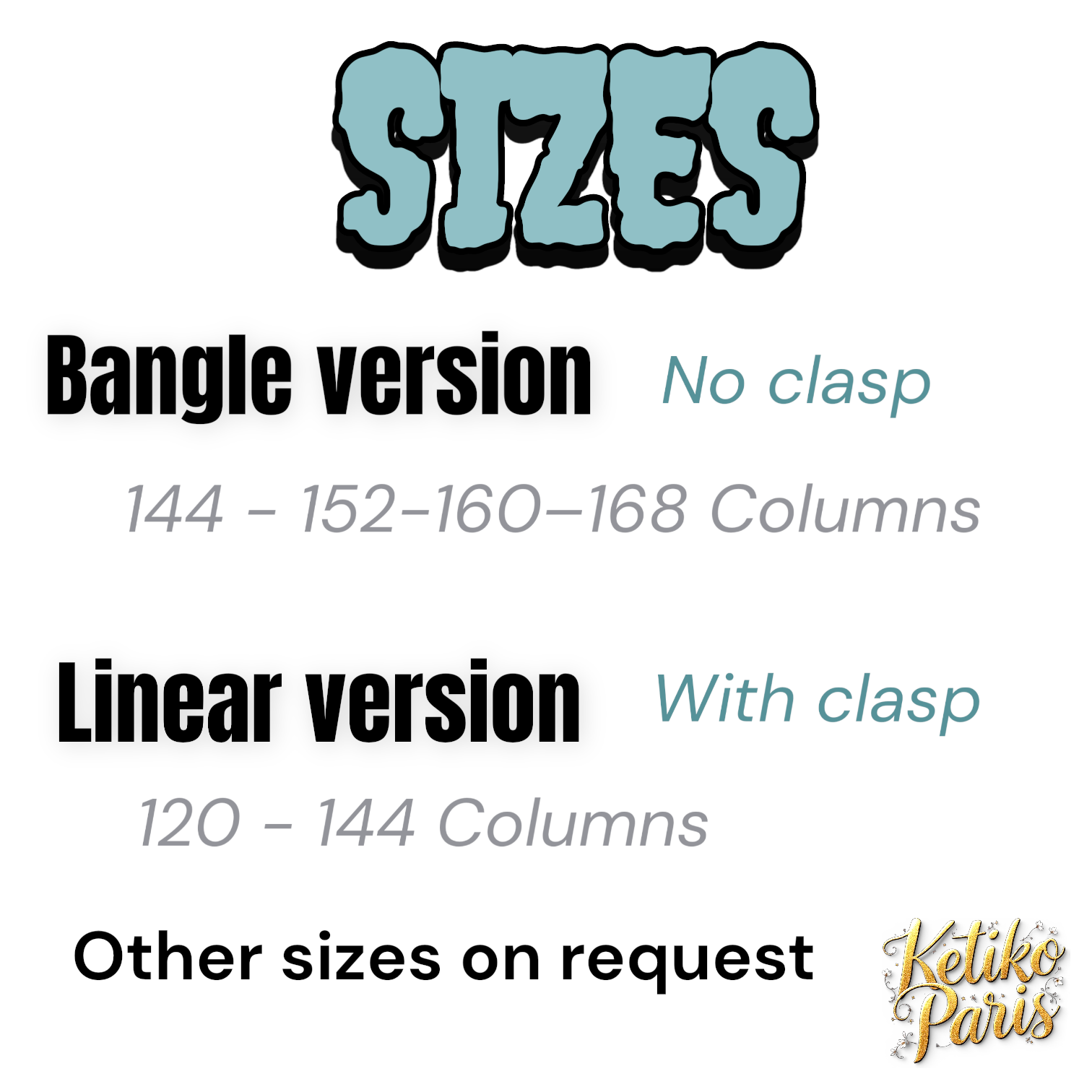 Mes basiques  : bangle et tissage horizontal comprends le modèle lineaire et un bangle taille M et parfois L. Les autres tailles sont fournies sur demandes si elles ne sont pas encore en ligne. Vous pouvez me demander plusieurs tailles.