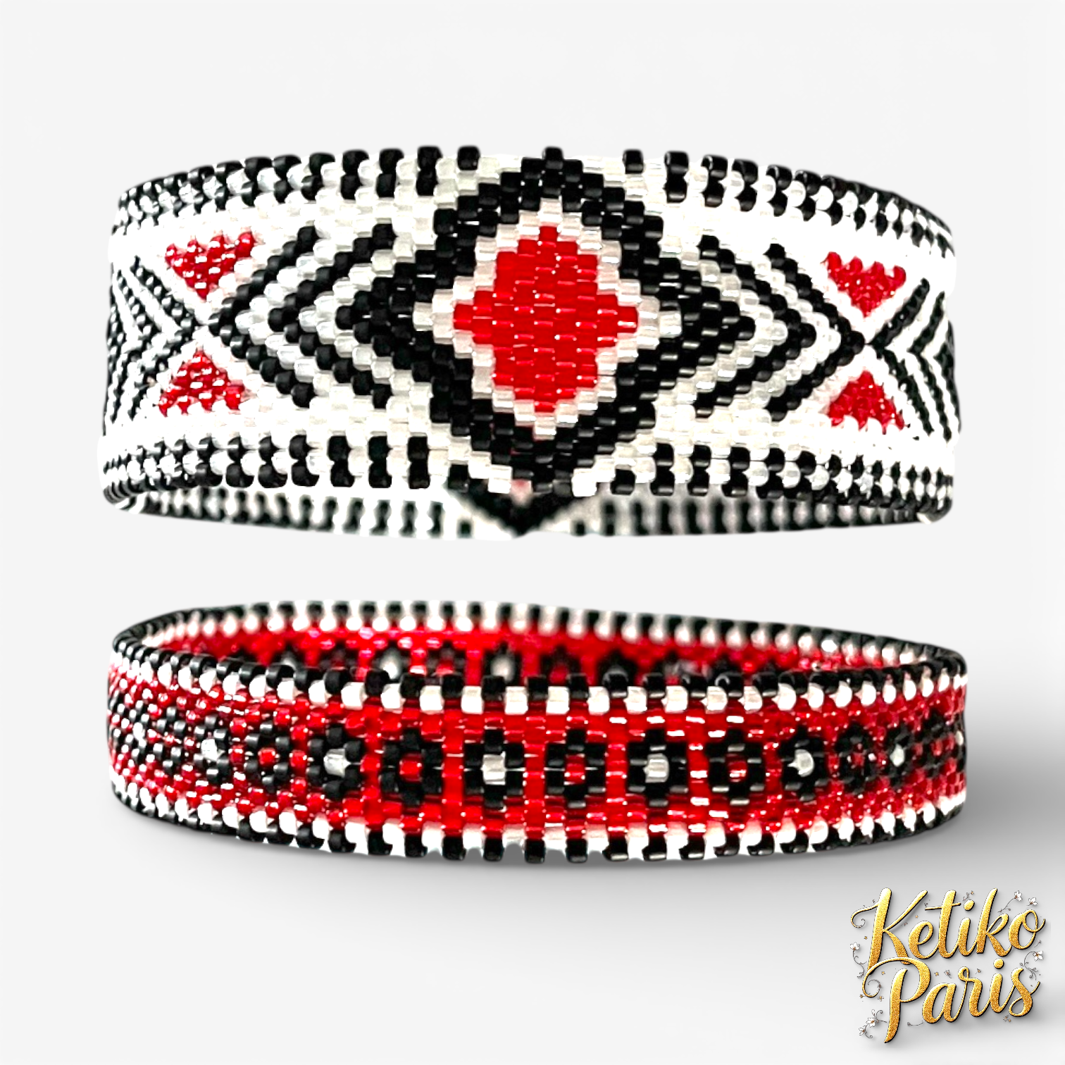 Le tissage est réalisé en point peyote, mais ils peuvent aussi être tissés en point brique (brick stitch) pour la plupart des modèles, excepté ceux tissés en peyote double ou triple ou ceux avec des inclusions de perles plus grosses.