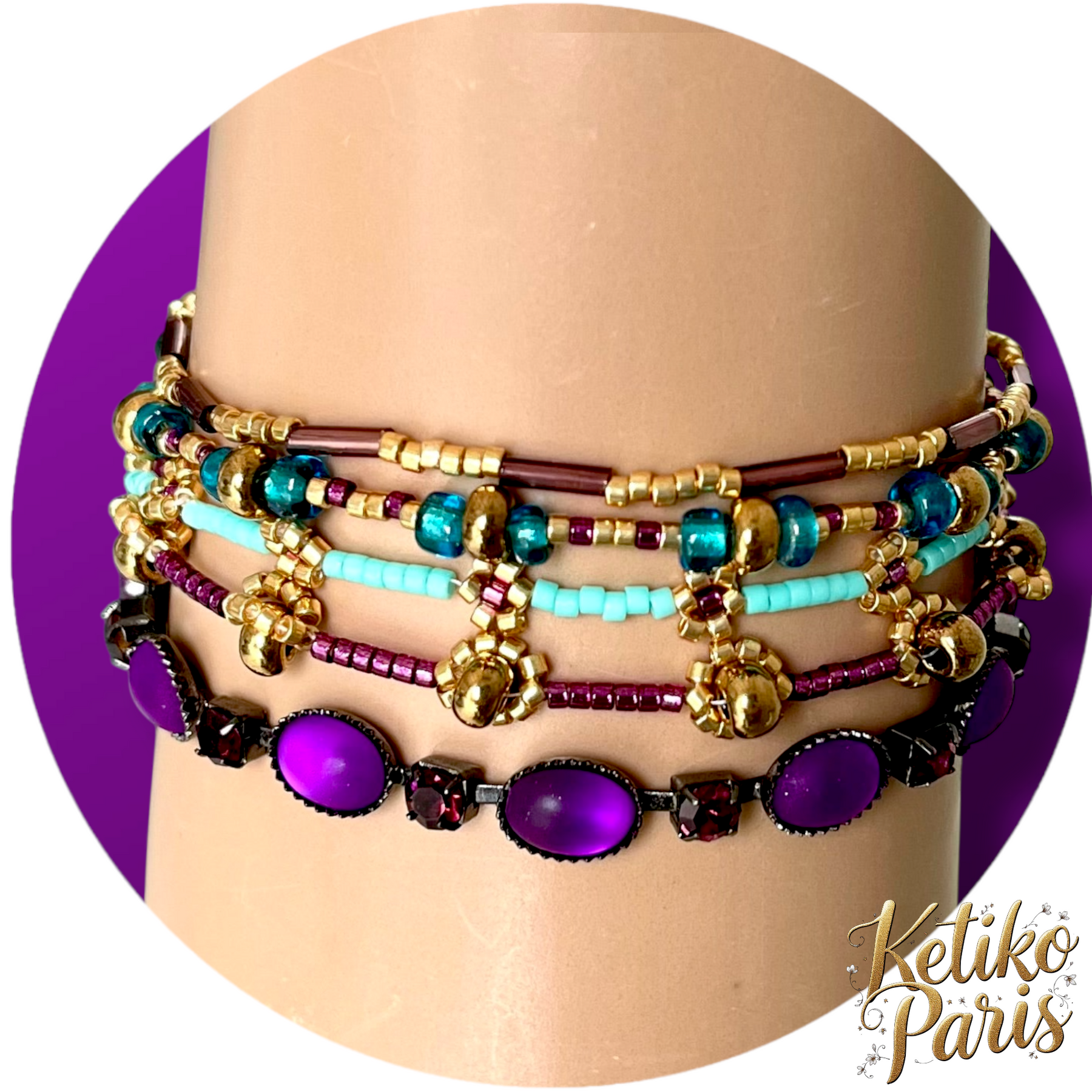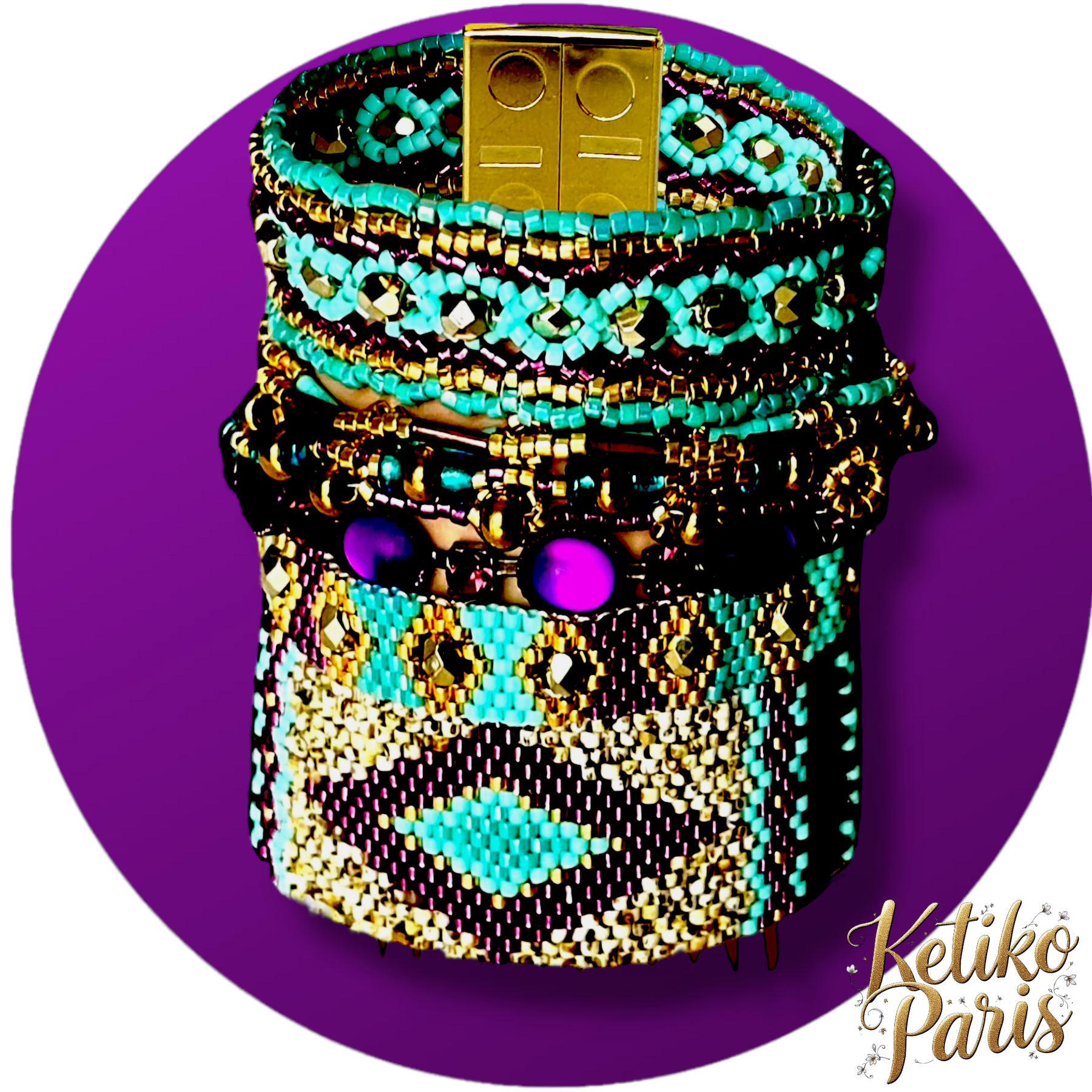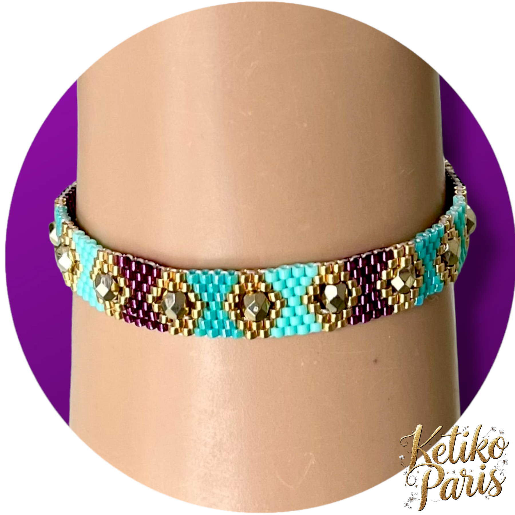 Schéma et explications pour réalisation de 4 bracelets traditionnels tissé en peyote pair impair et tissage fantaisie avec des perles miyuki delicas 11/0 et des facettes de bohème 4 mm. Vous pouvez aussi les acheter un par un.